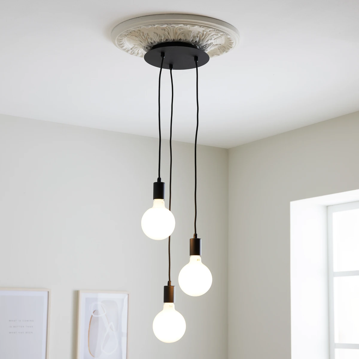 Sky-taklampe med rund takplate i metall. Sky-taklampe med rund takplate i metall, hvorav du kan justere lengden på de forskjellige ledningene, etter eget ønske. Benytt gjerne dekorpærer for et ekstra stilfullt touch.