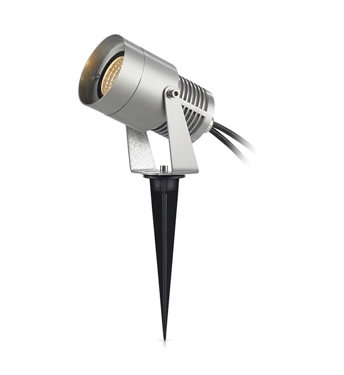 Spot i aluminium med 3W LED, godkjent til utendørsbruk. Inngang- og utgangskabel for mulighet til kobling av flere enheter. Jordspyd og beslag for montering på takrenne medfølger.