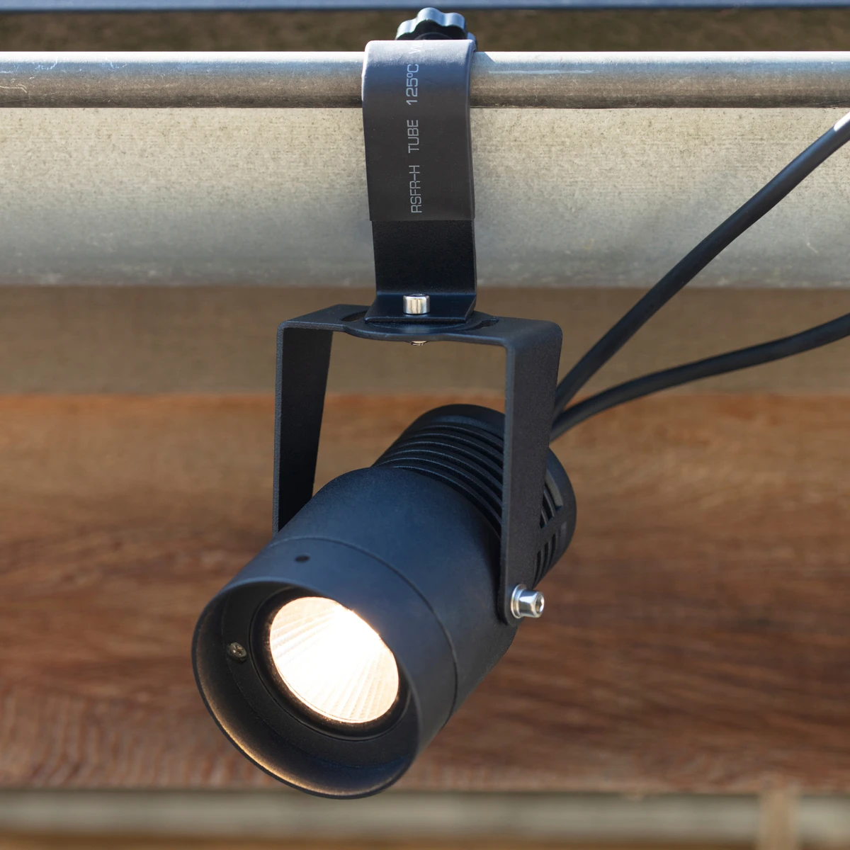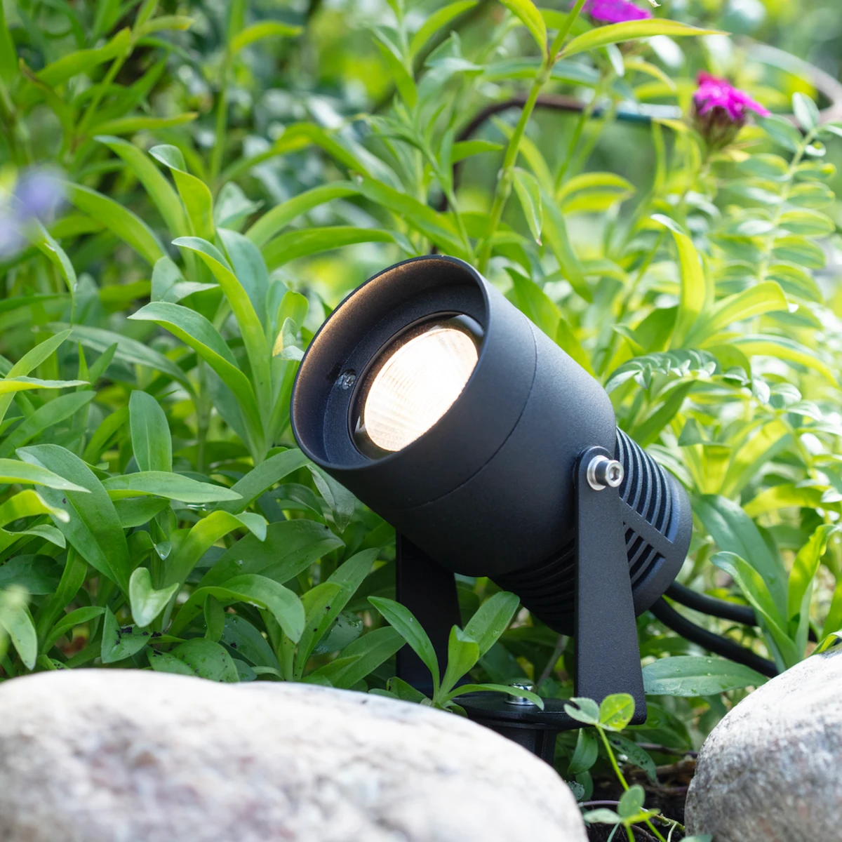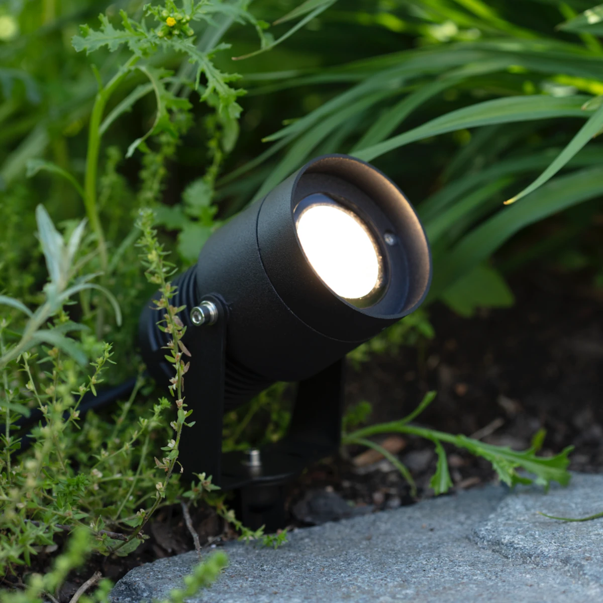 Garden spot 9w fra Markslöjd. IP44 godkjent for utendørs bruk. 9W LED. Leveres med spyd for bakkeplassering og braketter for montering på takrenner. Trafo kjøpes separat.