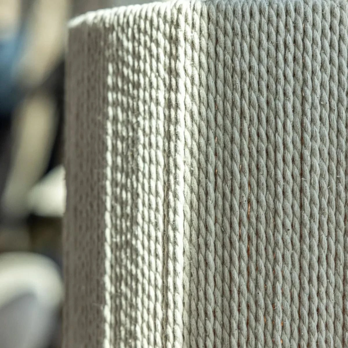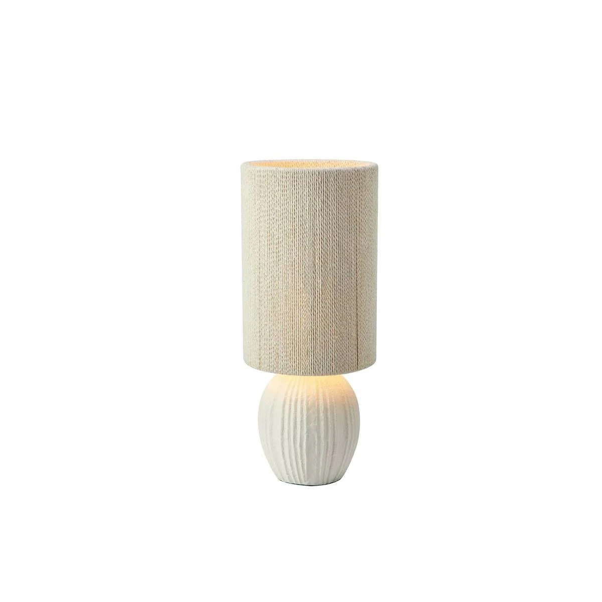 Beige bordlampe med høy, rett lampeskjerm av bomullstråd og avrundet beige lampefot i metall med grov og ujevn struktur.