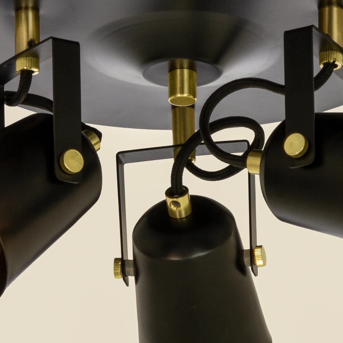 Metz rund takspot har et design som trekker i industriell retning med synlige snorer, messingfargede detaljer og lampehoder på metallrammer. Lampene er dreibare slik at du kan justere hvor du vil rette lyset, kanskje du vil lyse opp der du trenger det mest i hallen, eller hvorfor ikke rette lyset til et vakkert maleri i stuen.