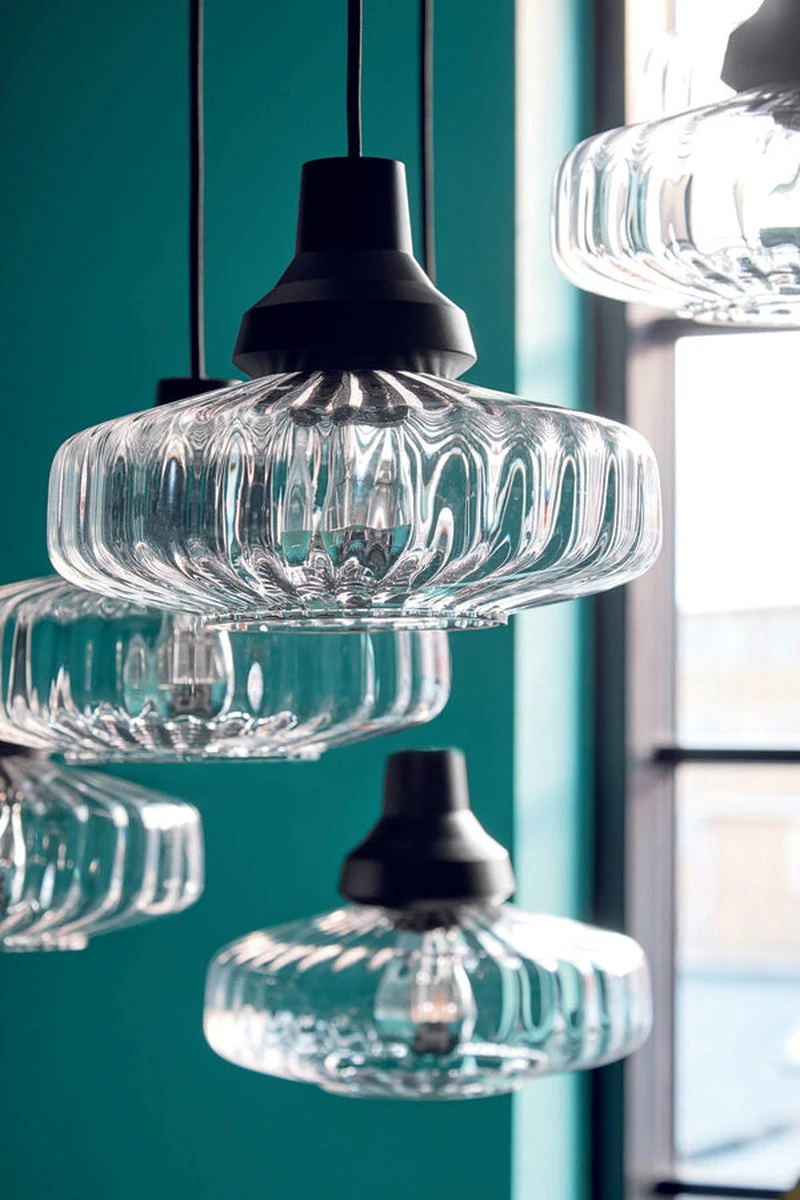 New Optic Wave takpendel er ett godt eksempel på hvordan en lampe kan skape ett helt rom, lampen sprer et fantastisk og levende lys på grunn av formen på det bølgete glasset. Alle lampene i New Wave serien er laget av munnblåste bølgete glass med med en håndmalt kant i sølv.