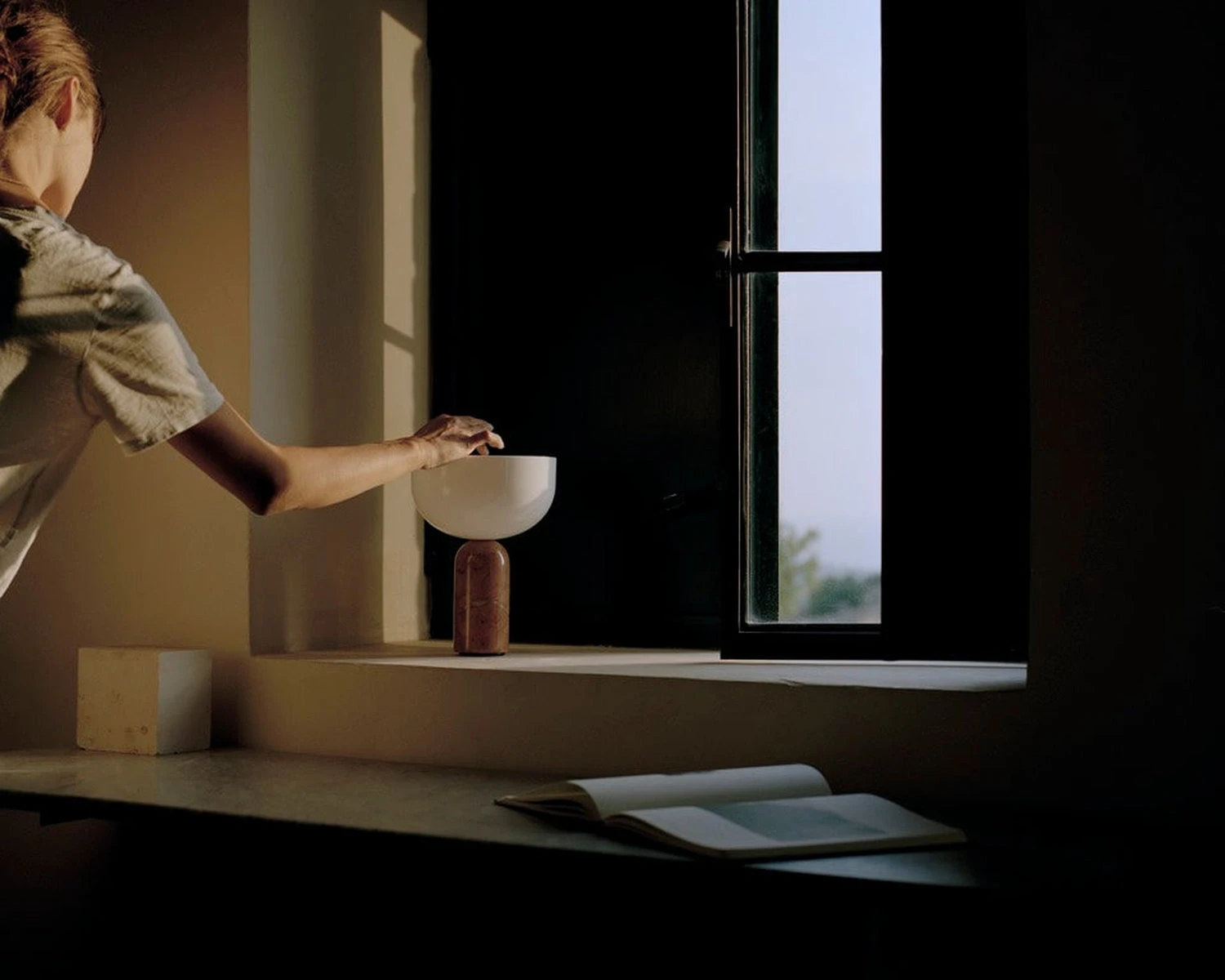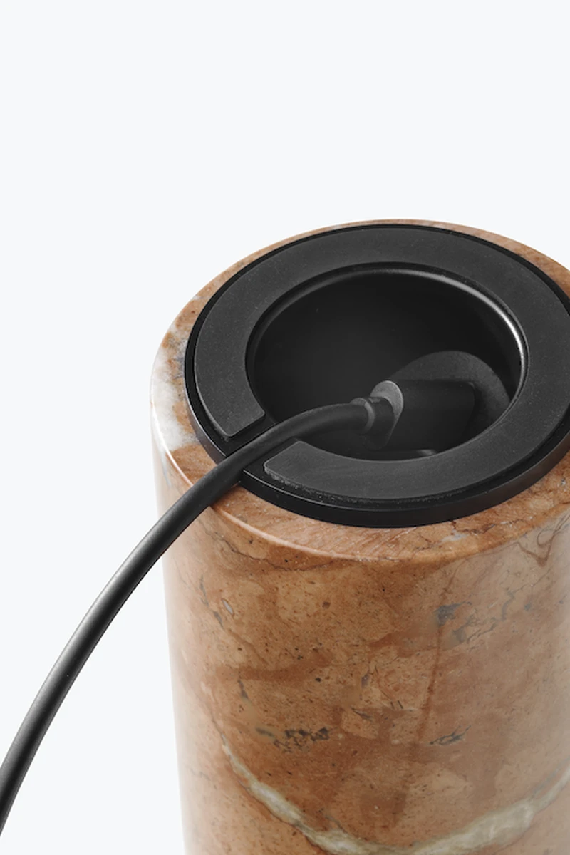 Kizu bordlampe balanserer dristige former og fascinerer øyet med sin skulpturelle komposisjon, og denne bærbare versjonen av lampen er intet unntak. Materialer og uttrykk er som vi kjenner dem, men denne trådløse, mindre størrelsen er lett å flytte rundt der det trengs lys. Med marmor som bæreelement får lampen naturlig stabilitet og den polerte steinen føles behagelig å ta på.