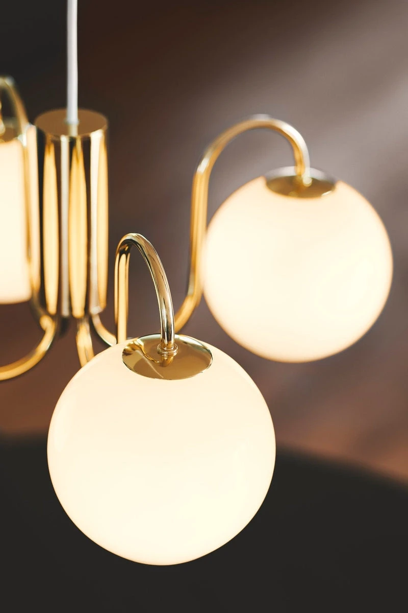 Franca-serien har et eksklusivt og elegant design med vakkert blankt glass og skinnende messing. Pendellampen henter inspirasjon fra den klassiske lysekronen og har vintagedetaljer med en moderne vri. De hvite glasskuplene skaper et mykt og diffust lys.
