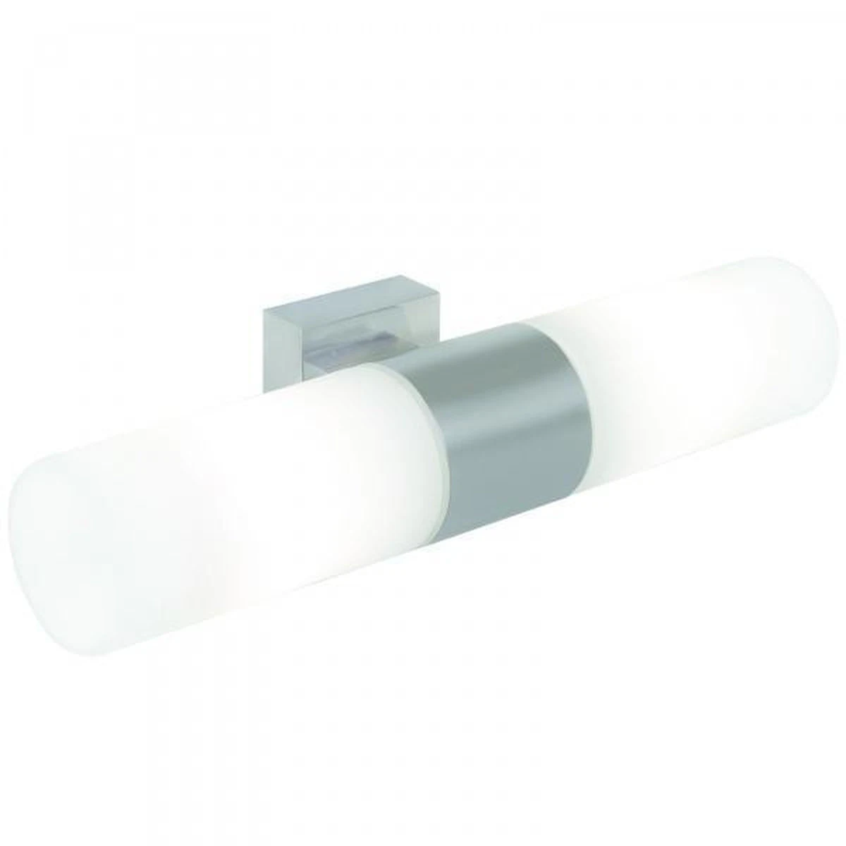 Spennende dobbelt vegglampe designet i rene og enkle linjer.Børstet stål og opal glass. Svært godt egnet for bad.