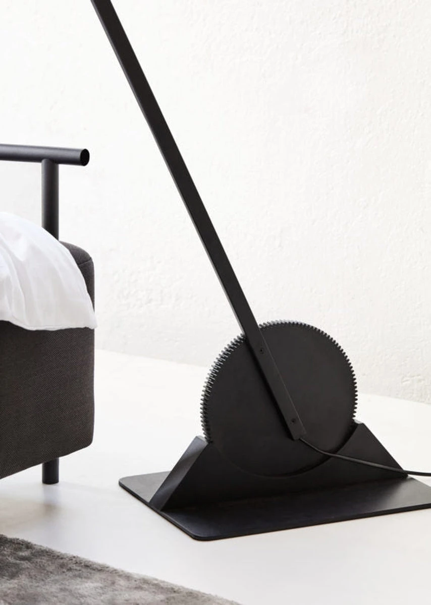 Gear gulvlampe er en stor og moderne lampe i industriell stil. Utførelse i matt sort stål og med bevegelige deler. Du kan endre lampens posisjon gjennom å justere den via en spak. Lampens posisjon låser seg etter hver justering og lyset kan justeres etter hvor mye lys du ønsker. Gear finnes i flere varianter.