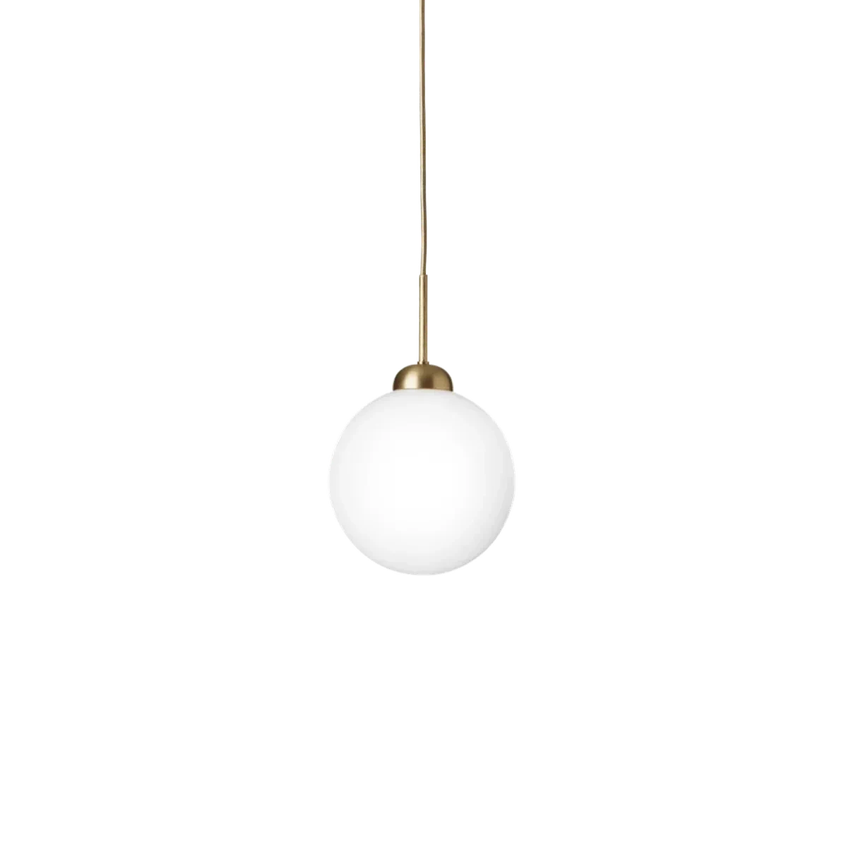 Apiales 1 Large har en stor kuppel av opalhvitt glass som gir et jevnt lys og som henger i en slank metallstamme i børstet messingfinish – en kombinasjon som koordinerer godt med andre metaller og farger.