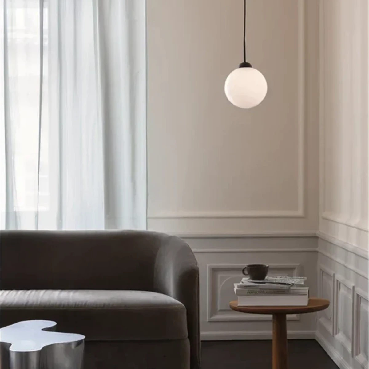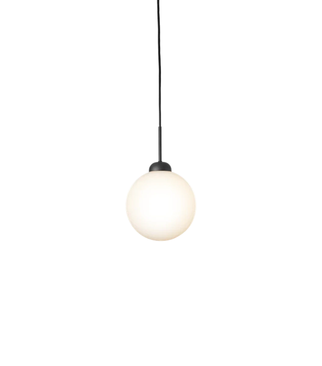 Apiales 1 Large har en stor kuppel av opalhvitt glass som gir et jevnt lys og som henger i en slank metallstamme i satengsort finish – noe som gir lampen et klassisk, men moderne uttrykk .