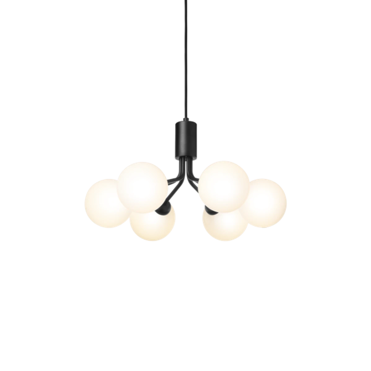 Med inspirasjon fra blomster, bretter Apiales 6 ut de sorte sateng metallstilkene til opalhvite glasskuler, og tilbyr et mykt og behagelig uttrykk til rom med begrenset plass.
