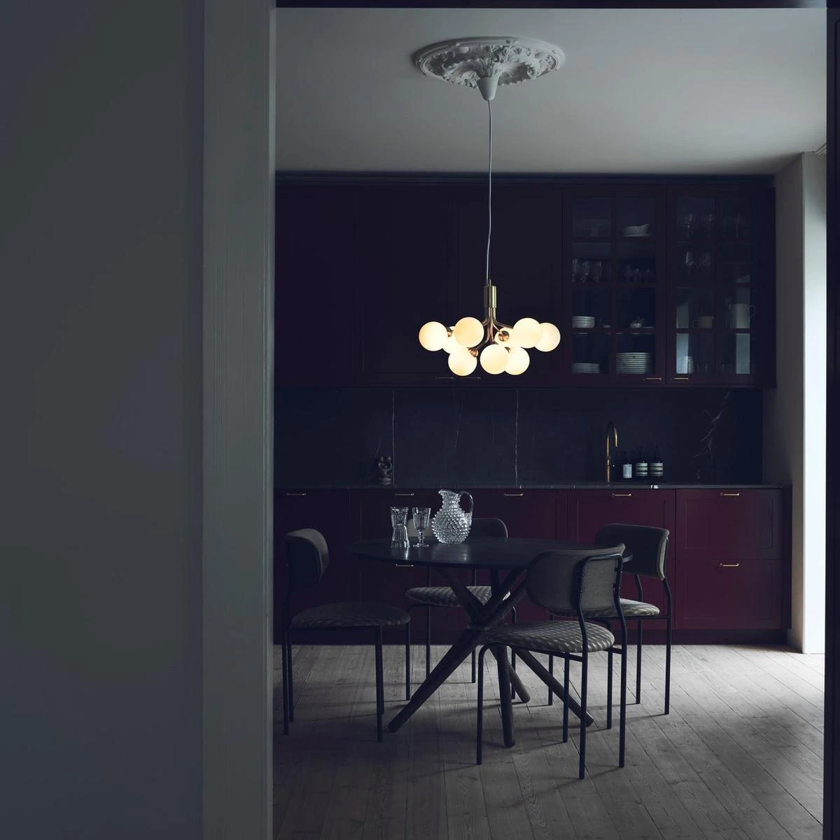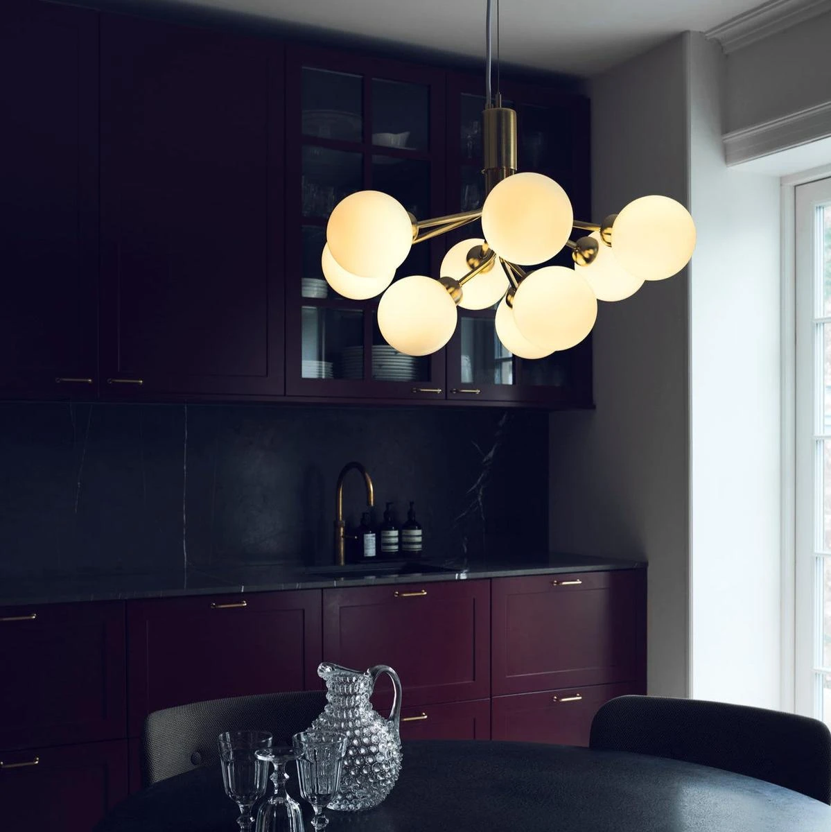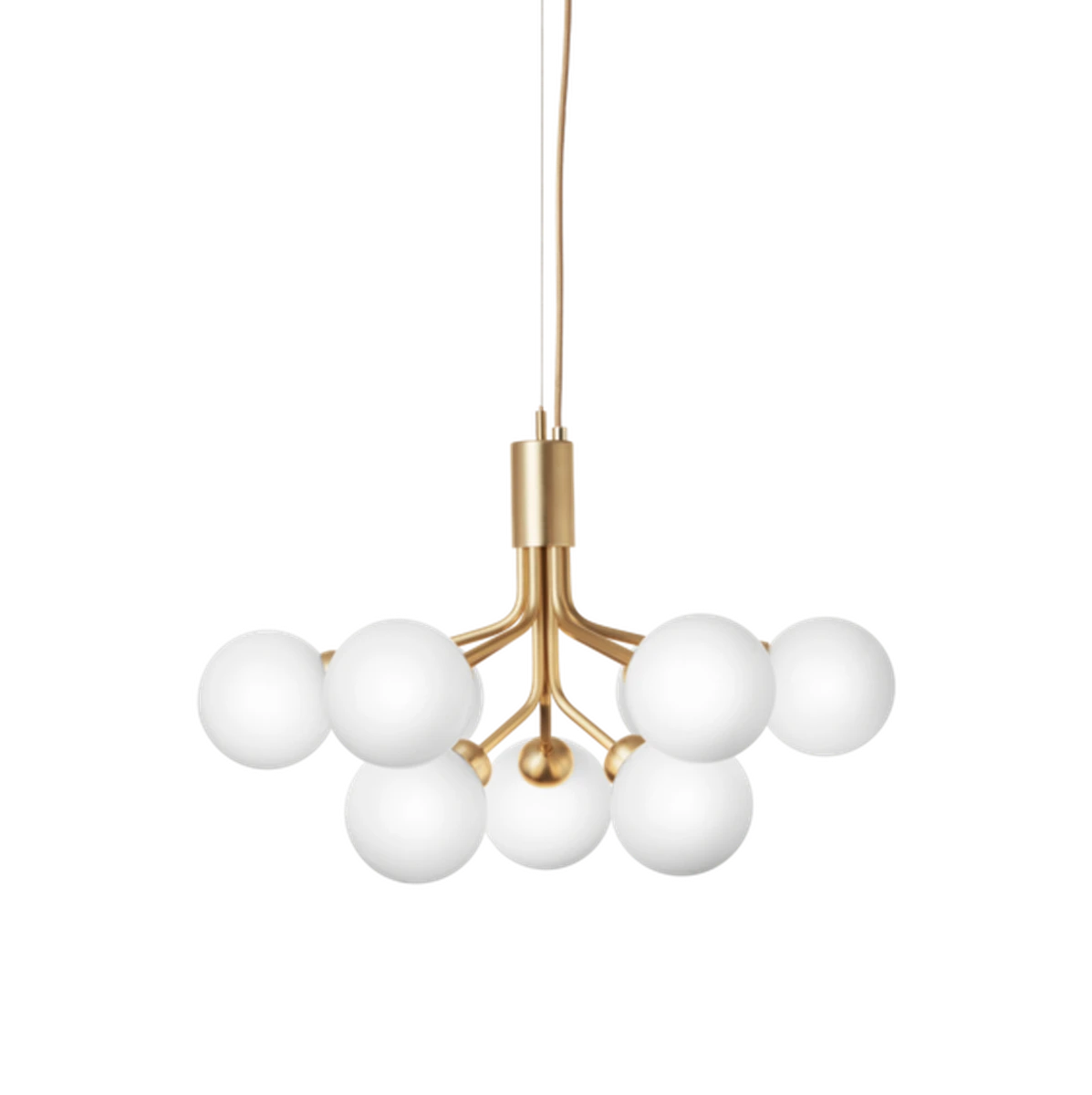 Inspirert av blomster har Sofie Refer designet Apiales-kolleksjonen. Samlingen består av to lysekroner med 9 eller 18 munnblåste glassbolter og er tilgjengelig i gylden Brush Brass-finish eller den glatte Satin Black.