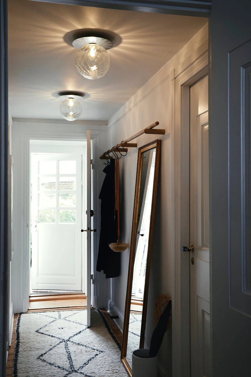 Liila 1 er en enkel lampe som ser vakker ut på veggen eller i taket. Den er enkel i sin form, og består av en tynn rund metallplate og en unik, munnblåst glasskuppel. Liila 1 passer til mindre rom, bad og til entréen.