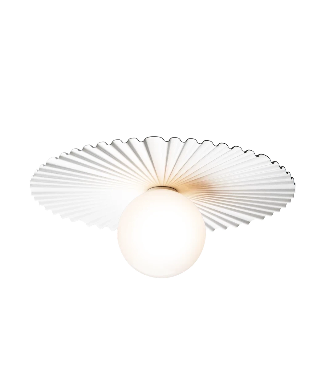 Liila Muuse Medium er en vegg- og semi-innfelt taklampe med referanser til den gamle fornøyelsesparken Tivoli i København. Muuse er en utvidelse av Liila-serien der den runde bakplaten er oppdatert med asymmetriske kurver, noe som skaper dette lekne lampedesignet. Den hvite metallfinishen har en gipslignende tekstur, som ligner takstuckdekorasjoner i gamle, klassiske bygninger og skaper et takmedaljongutseende i hjemmet. Dekorer gangen med Liila Muuse Medium og la den lille opalhvite glasskulen skånsomt spre lyset.