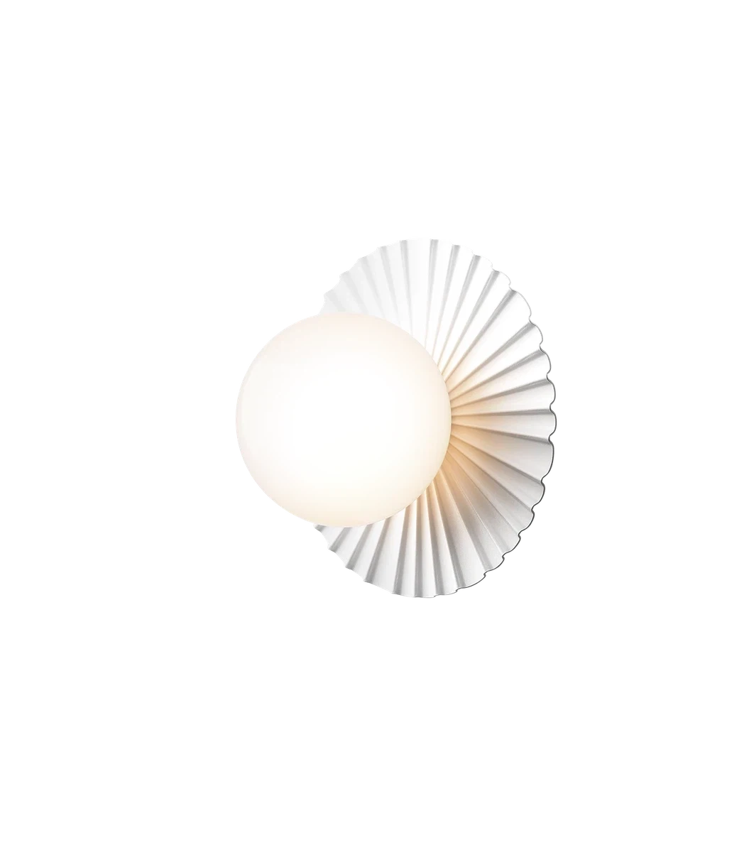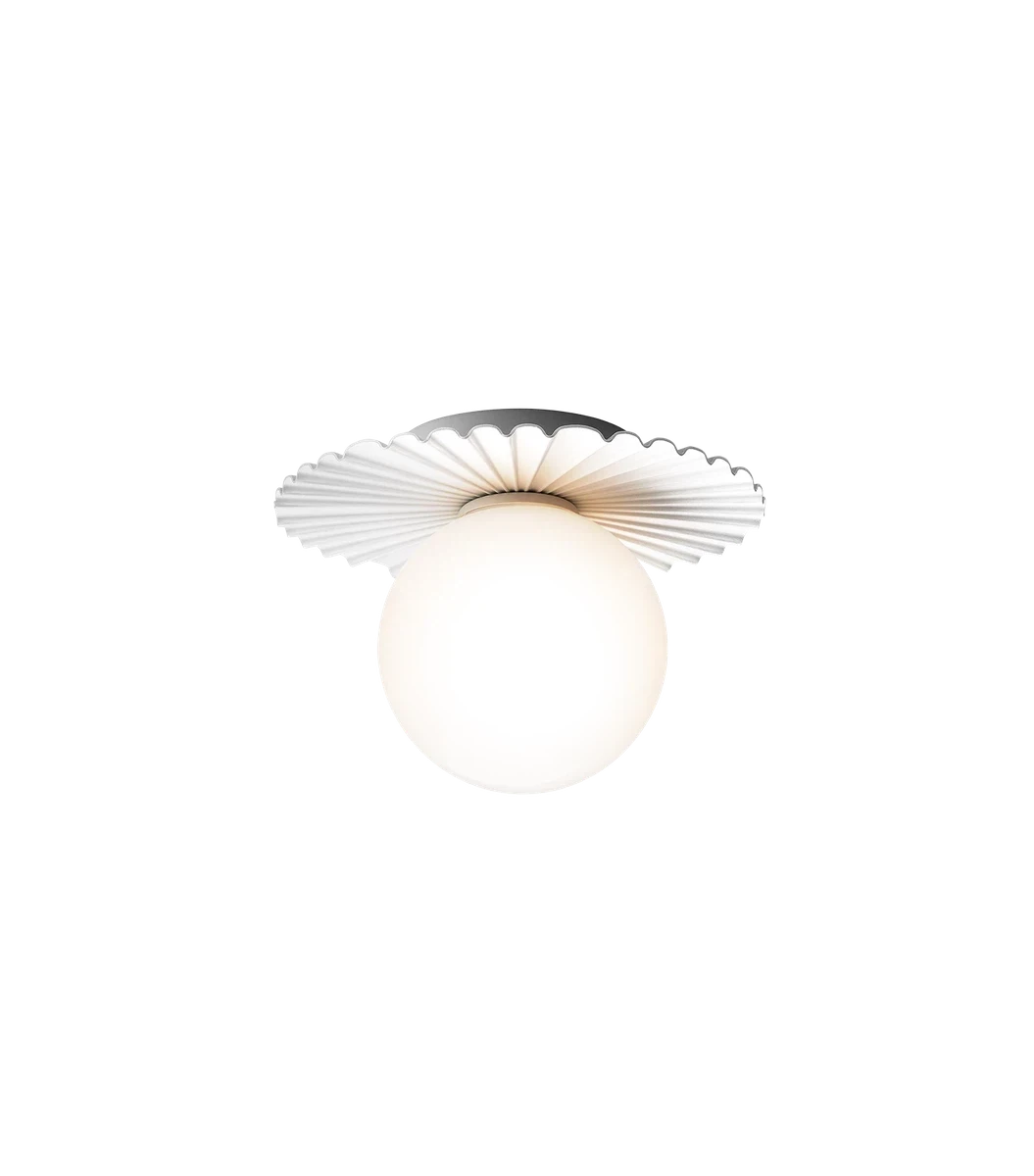 Liila Muuse Small er en vegg- og taklampe i et kunstnerisk og morsomt stiluttrykk. Den runde metallbakplaten er stylet med asymmetriske bølger, som reflekterer lyset fra den lille opalhvite glasskulen plassert i midten av lampen. De myke kurvene og det hvite pulverlakken skaper assosiasjoner til de klassiske hvite takmedaljongene i eldre bygninger. Liila Muuse Small kan brukes som en liten, dekorativ nattlampe der den relativt lille størrelsen ikke tar mye plass.