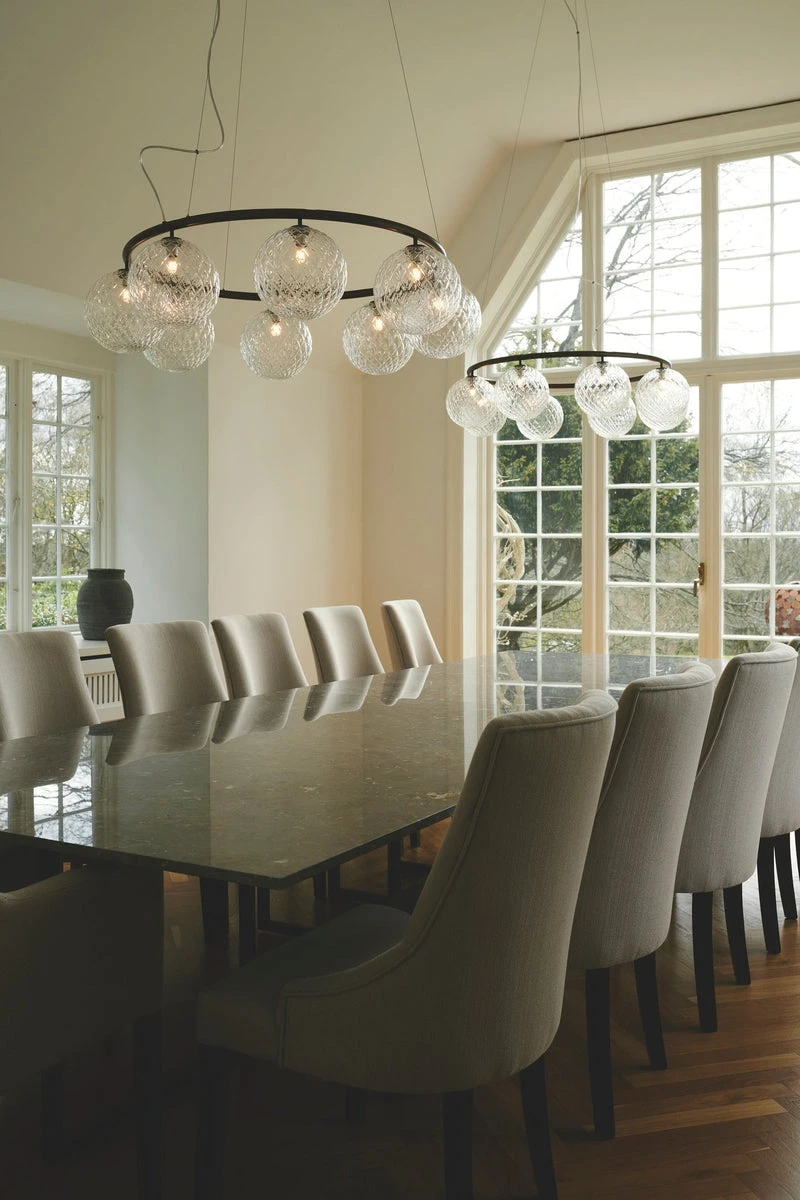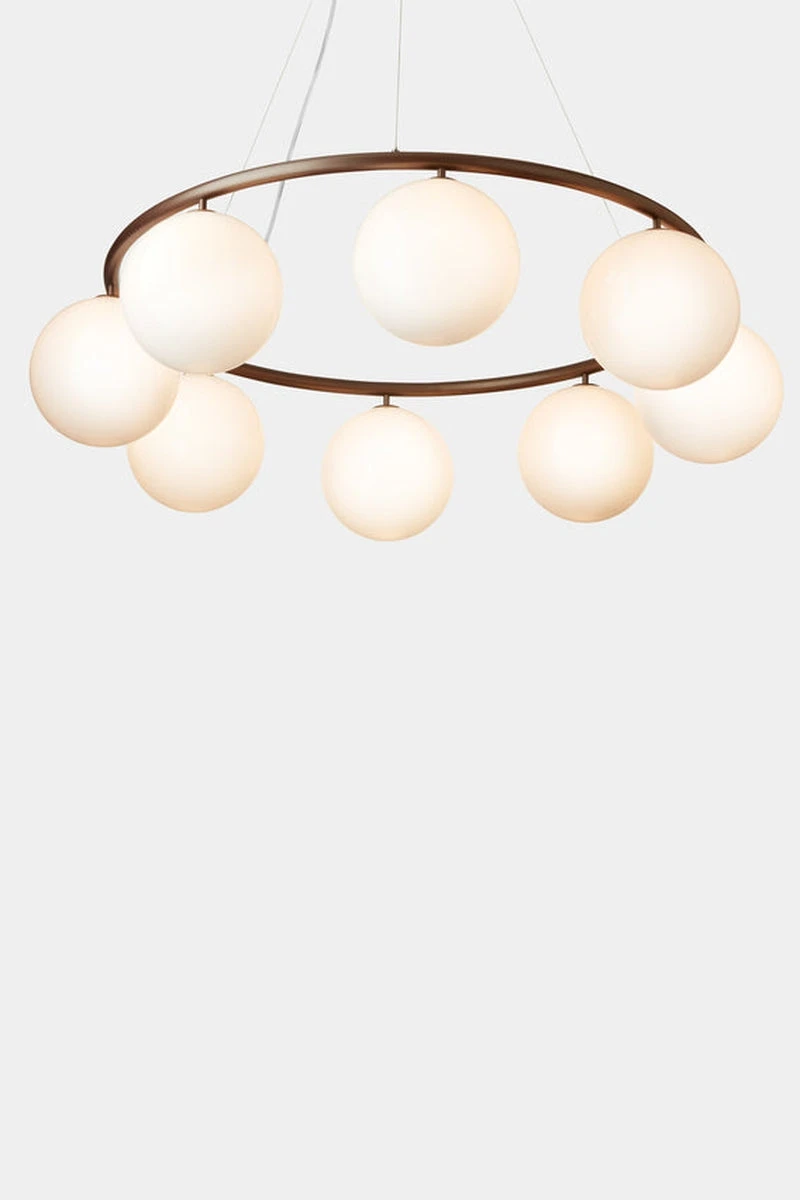 Miira 8 Circular Dark Bronze har et klassisk utseende og er designet for å henge høyt eller lavt fra taket. Et spesielt trådsystem brukes til å justere høyden enkelt fra 45 til 250 cm. Lysekronen Miira består av en pulverlakkert metallring i en mørk bronsefarge, og fra dette sprer munnblåste glasskupler et stemninsskapende lys. Det enkle og klassiske designet gjør denne lysekronen til et yndet designelement, både i private hjem og i det offentlige. Lysekronen har en diameter på 100 cm, noe som gjør den ideell for plassering over et spisebord eller over en sofa.