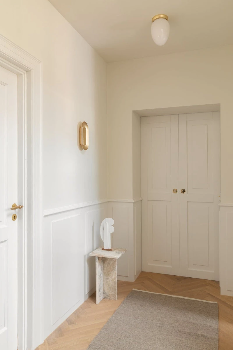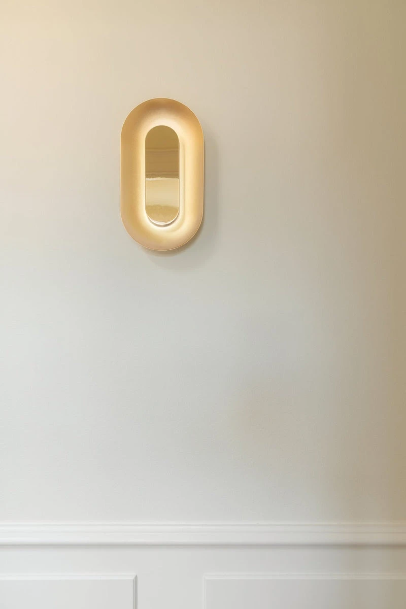Dekorativ vegglampe med et mykt uttrykk og et behagelig, indirekte lys. Sasi Large vegglampe er konstruert med en stor rund metallramme i sateng messing finish og en lampeskjerm i polert messing finish. En integrert LED-modul er plassert bak den polerte skjermen og reflekterer lyset i den store metallrammen. Sasi Large vegglampe kan fungere både som et dekorativt element og som ambient belysning i stuen.