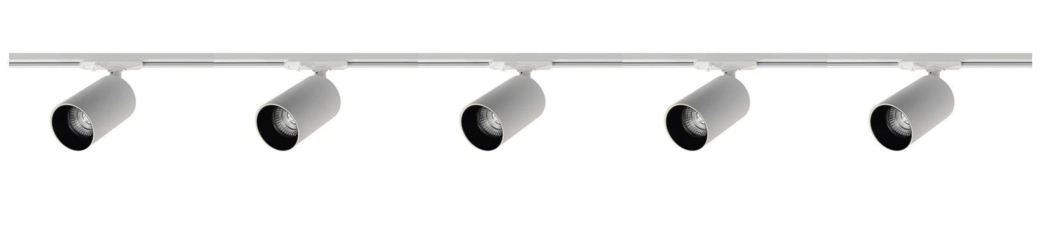Komplett 2 meter spotskinne med 5 spotter og endetilkobling. 5 stk lyspærer med GU10-sokkel kjøpes separat.