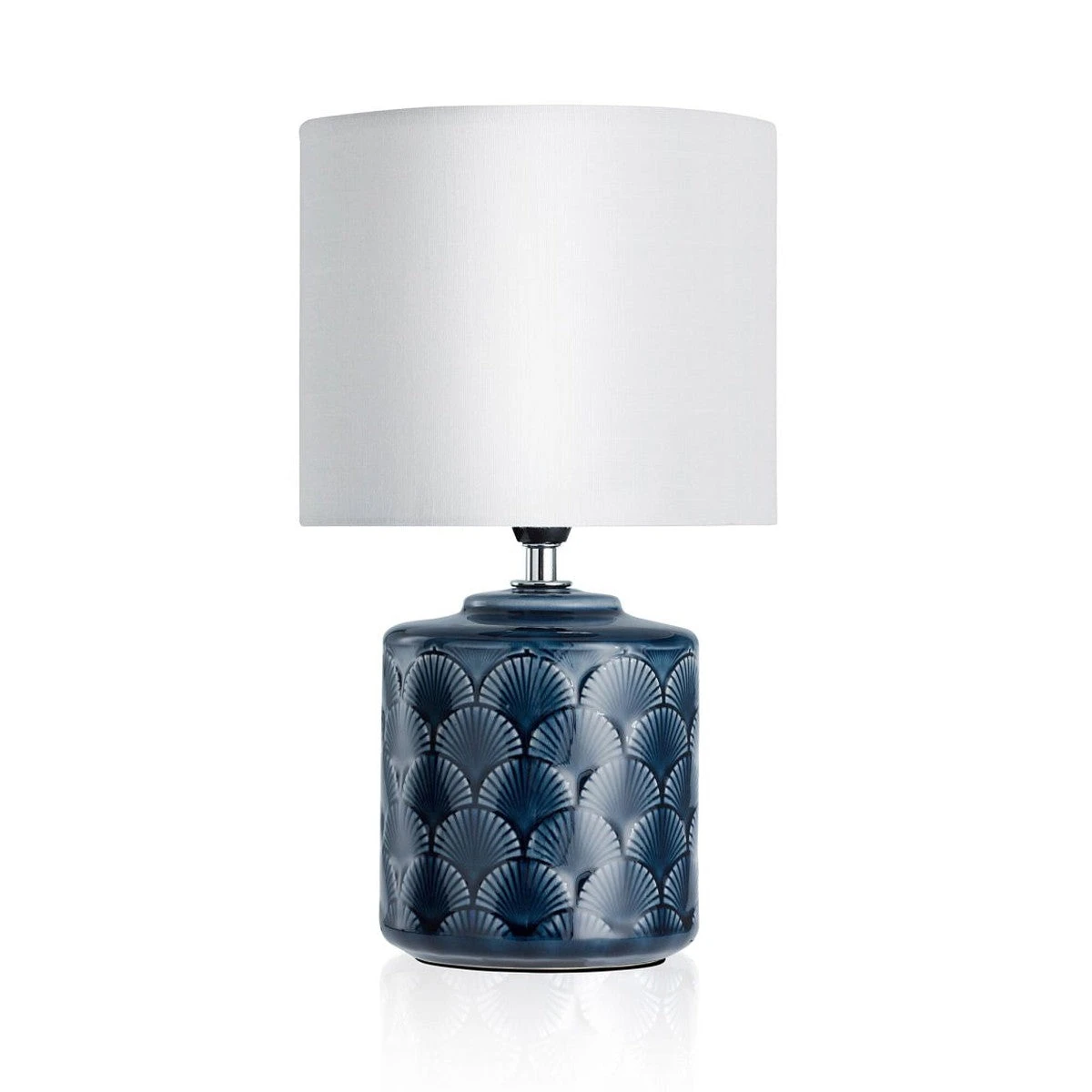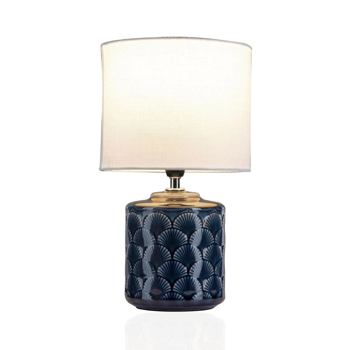 Bordarmaturen Glowing Midnight er laget av fineste keramikk, belagt med en høyglans lakk i mørkeblått. Den hvite stoffskyggen gir en behagelig kontrast som får frem den skjelllignende strukturen til den keramiske basen. Bordarmaturen Glowing Midnight passer til soverommet, stuen, gangen med mer, og skaper en koselig boatmosfære