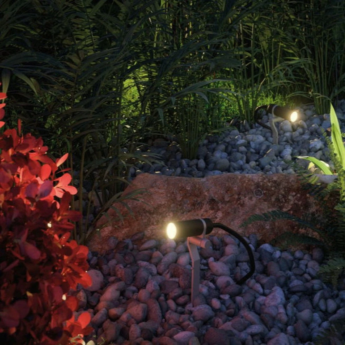 Plantini Plug & Shine jordspyd med en strålevinkel på 40 grader og varmt hvitt lys er ideell for å belyse små busker og blomster. Den kan justeres etter behov. Med transformatorer, kontakter og tilleggsarmaturer fra Plug & Shine-serien kan du sette sammen en individuell belysningsinstallasjon for uterommene dine.