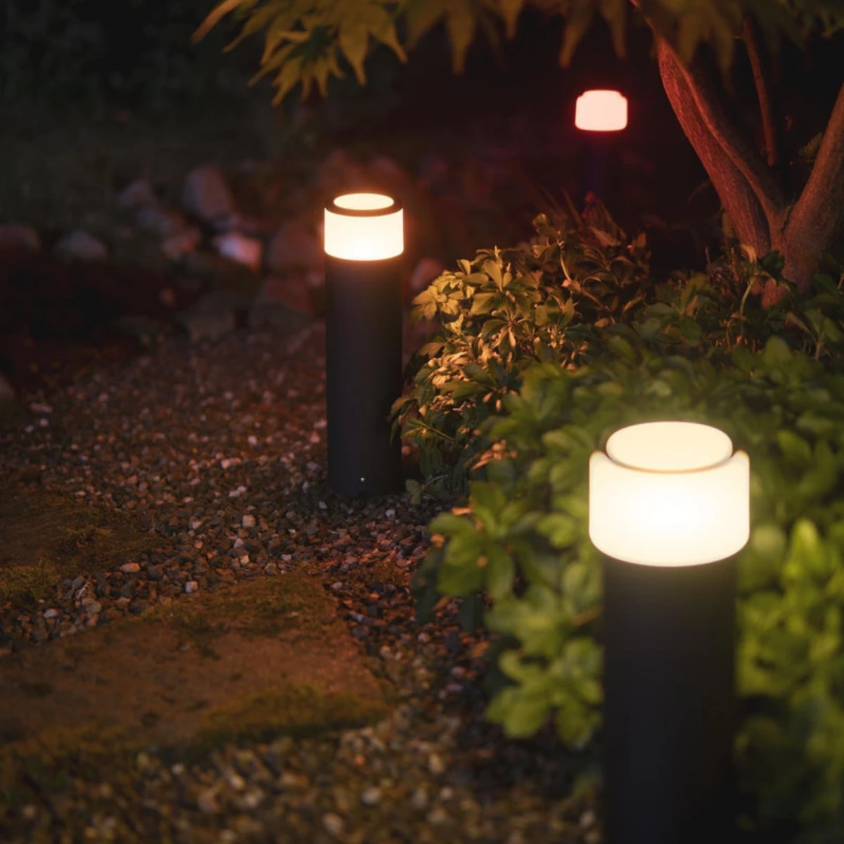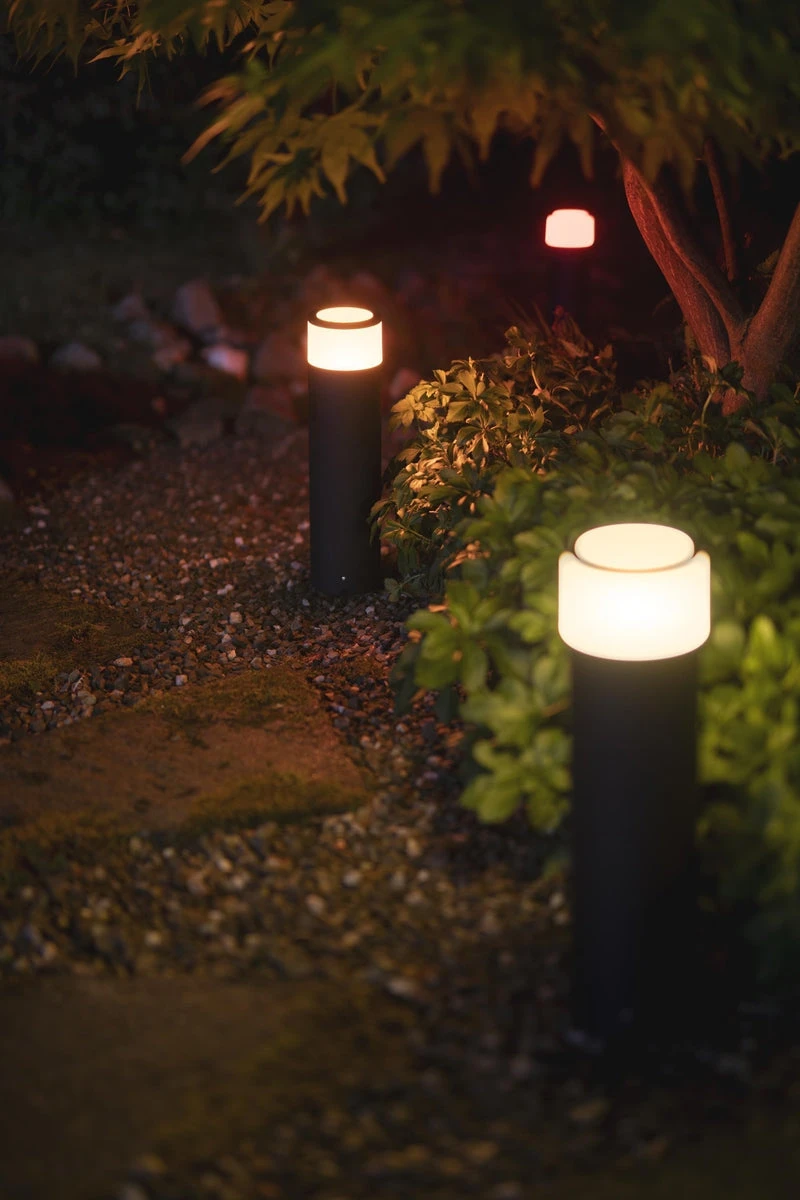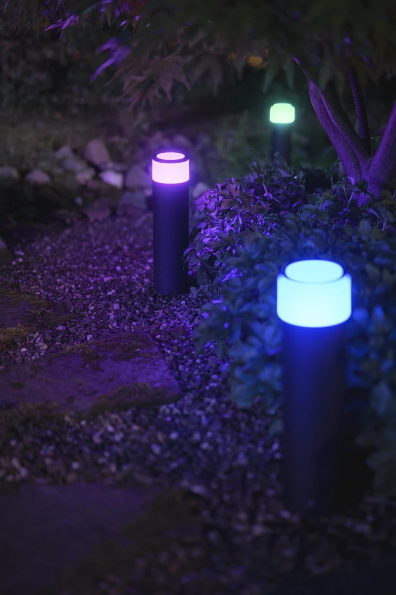 Nyt de 16 millioner tilgjengelige fargene for å forskjønne hagen din, eller bruk den på en mer praktisk måte ved å lyse gangveien funksjonelt for solnedgang til daggrybanebelysning fra solnedgang til daggry. Utendørslysene er helt værbestandige. Krever Hue bridge.