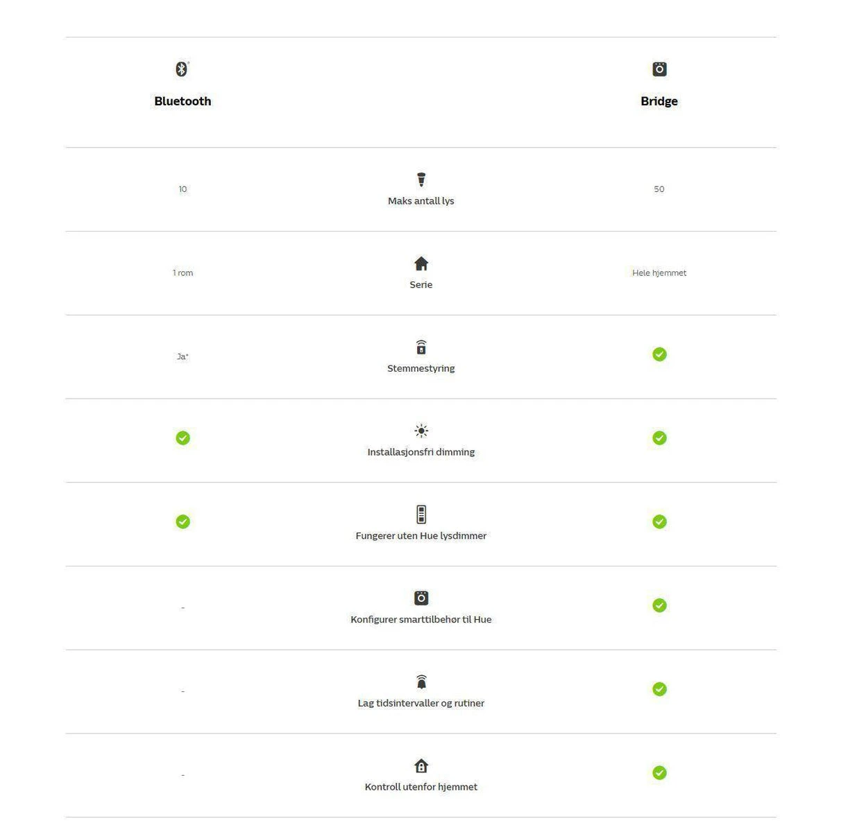 - Programvare kan oppgraderesNår koblet til Bluetooth-appen eller Hue Bridge