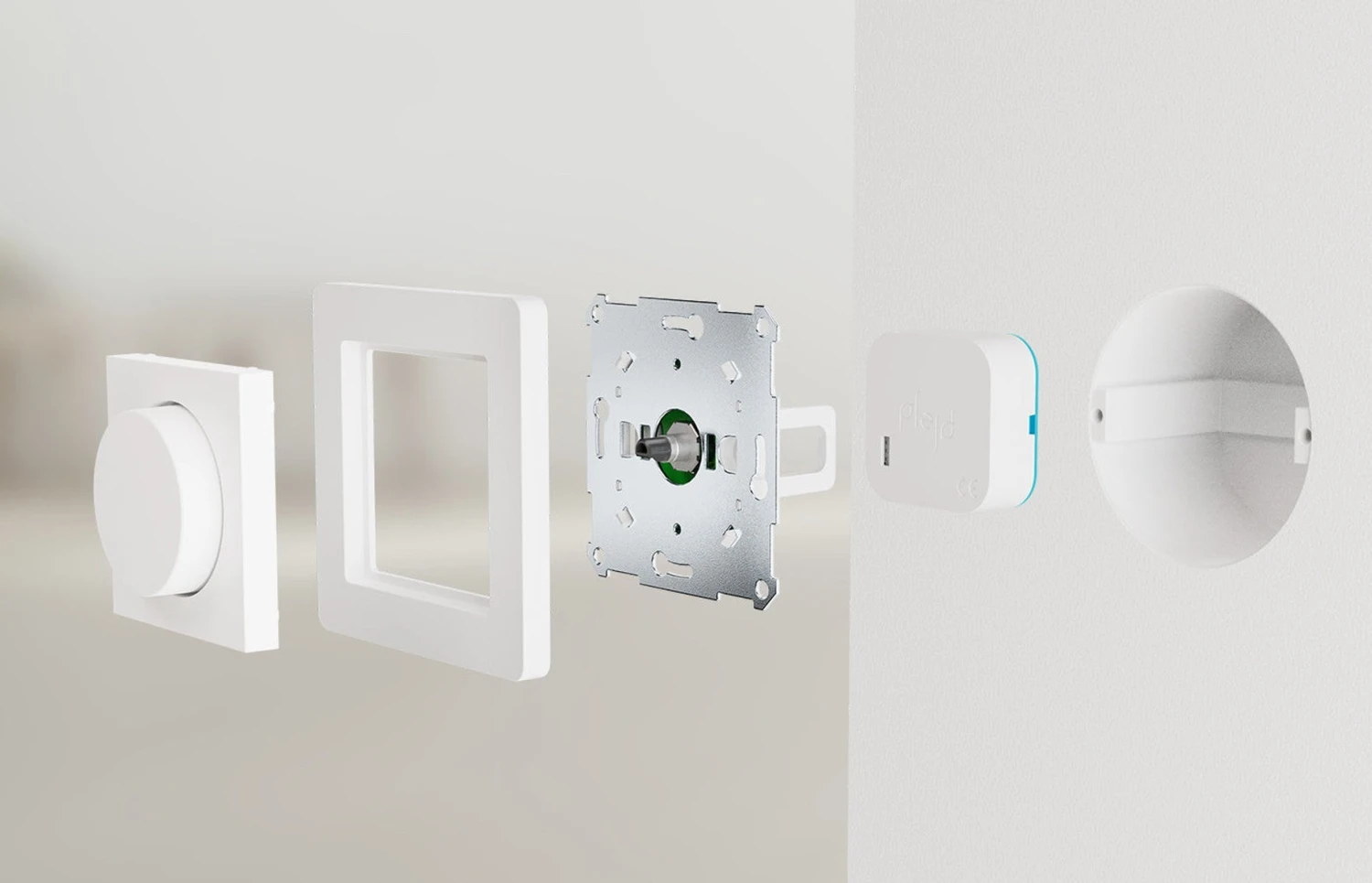 Koble produktet til et hvilket som helst Plejd-puck i systemet og monter enkelt i boksen. Produktet kan monteres i en dobbelramme sammen med en vanlig strømbryter eller frittstående på egnet sted.