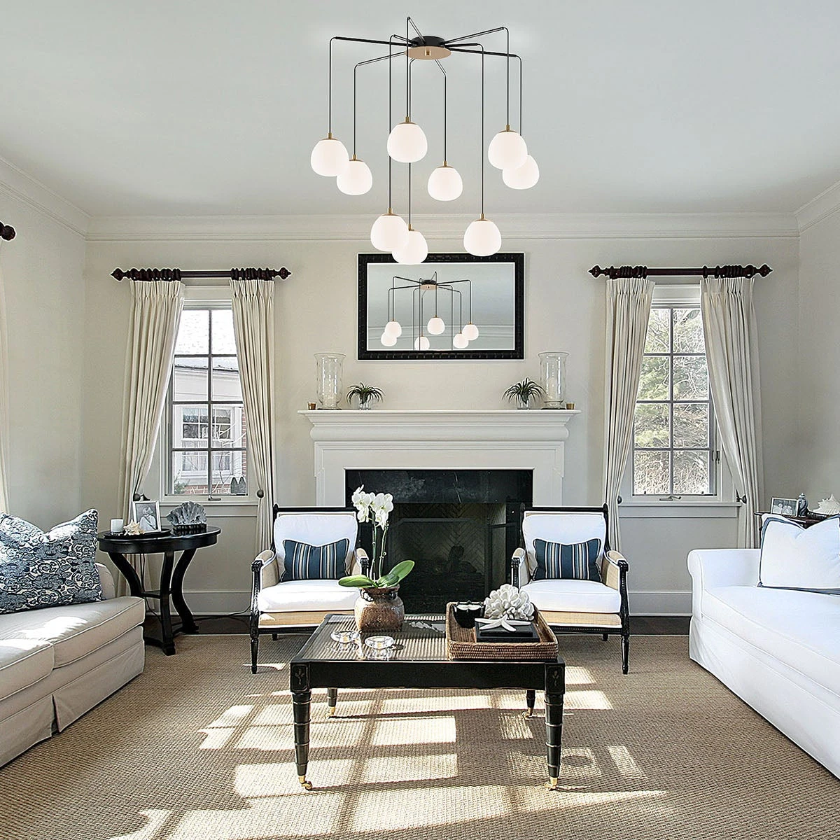 Raindrop taklampen tilfører en unik eleganse og et vakkert lysspill til ethvert rom. De ni runde glasskulene reflekterer lyset jevnt og skaper myke skygger og en behagelig atmosfære.