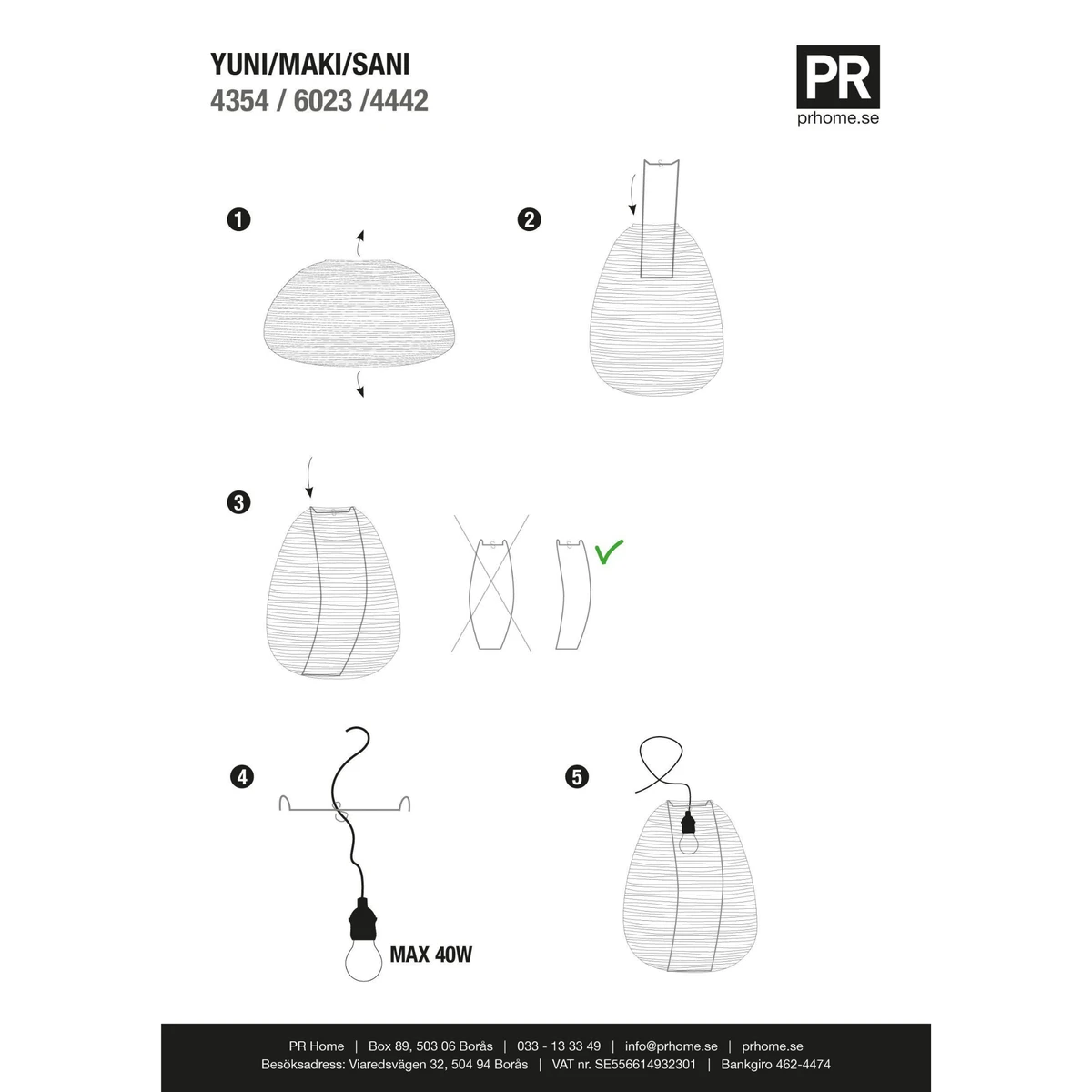 Skjermen leveres flatpakket, med en medfølgende metallekspander som brukes inni lampeskjermen for å holde lampens form. Ettersom lampeskjermen er laget av papir, må den håndteres forsiktig når metallrammen settes i.