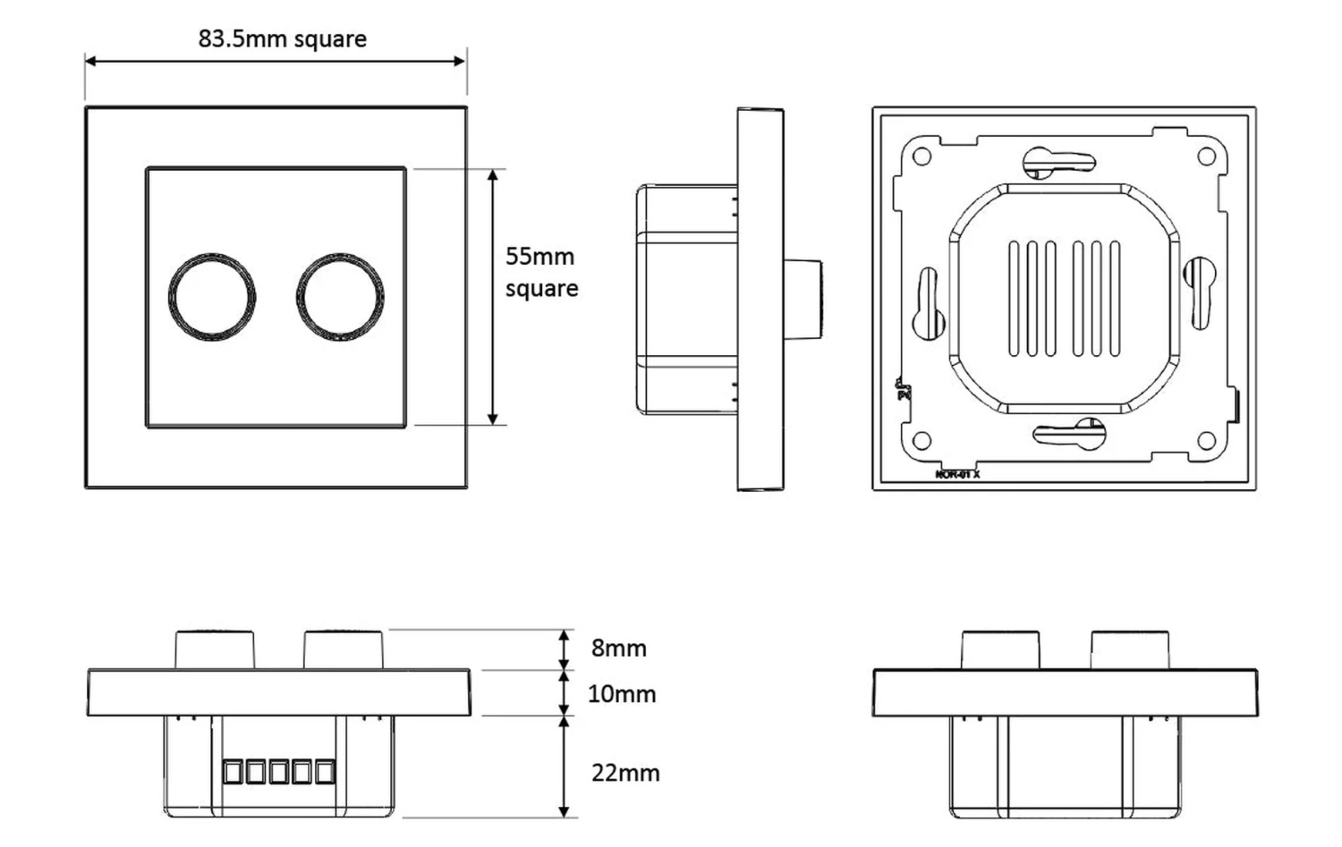 LEDDim 2×100 fasesnittdimmer sikrer stabil dimming av lyset uten tilkoblet N. Dimmeren kan styre 2 laster og lysnivåene justeres etter lyskildene ved å stille inn minimums- og maksimumsnivået manuelt.