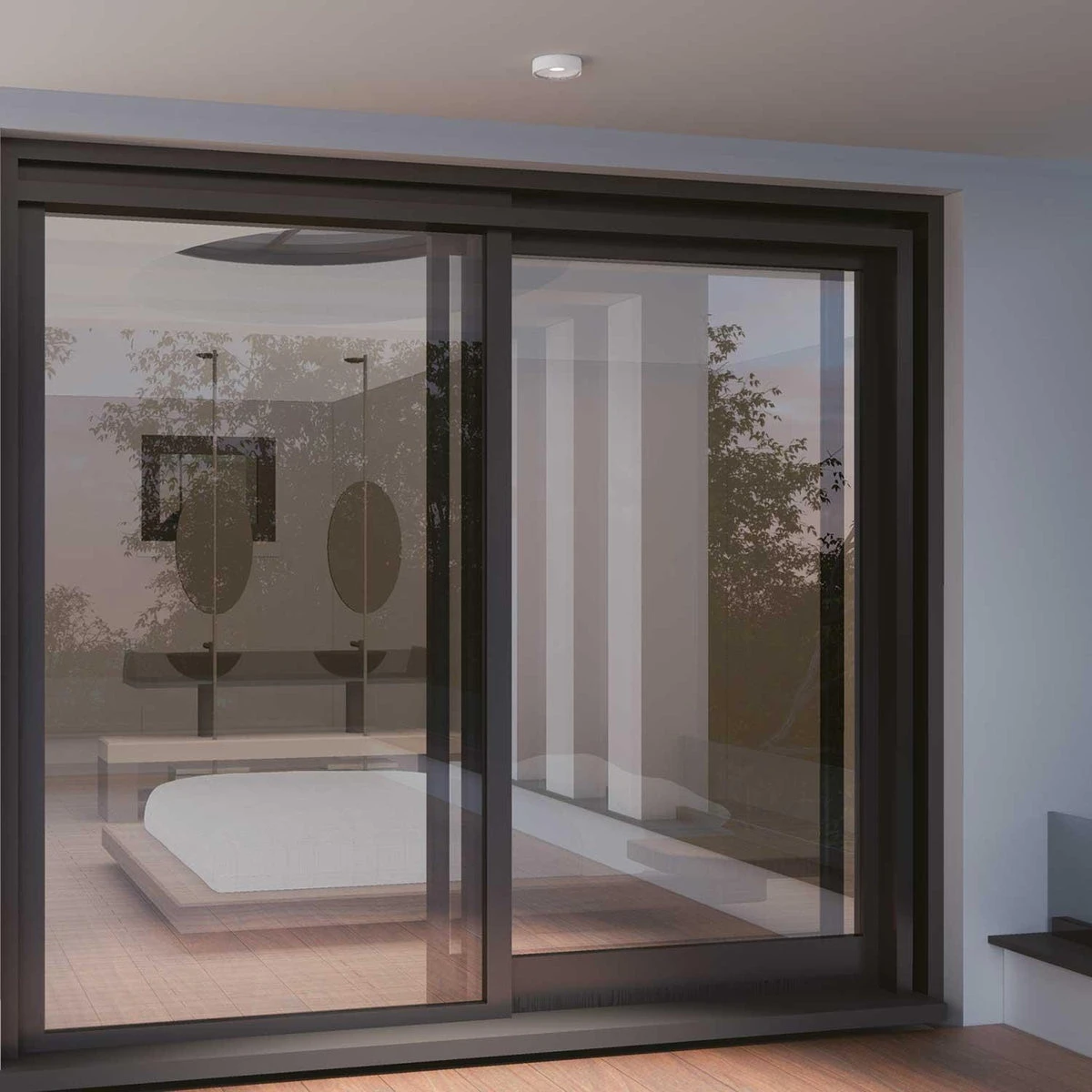Lampen er tilgjengelig i svart eller hvitt med en IP65-kapslingsgrad, noe som gjør den god til utendørs bruk.