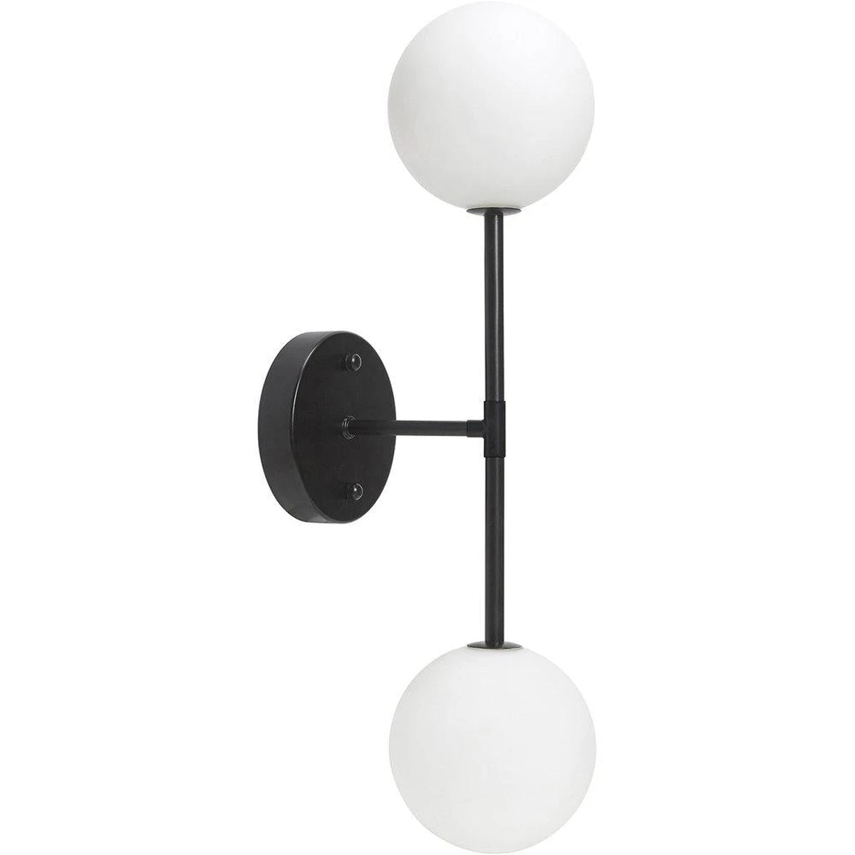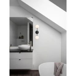 Vegglampe i minimalistisk design med opalglass og metallramme i matt sort. Den er fuktsikker i IP23-klassifisering og passer godt i baderomsmiljøer. Siden glassskjermen er håndlaget kan det av og til være luftbobler i glasset samt en viss ujevnhet i glasstykkelsen over glassflaten. Vær oppmerksom på at denne armaturen er for fast installasjon og at den ikke leveres med separat kobling og tilkoblingskabel.