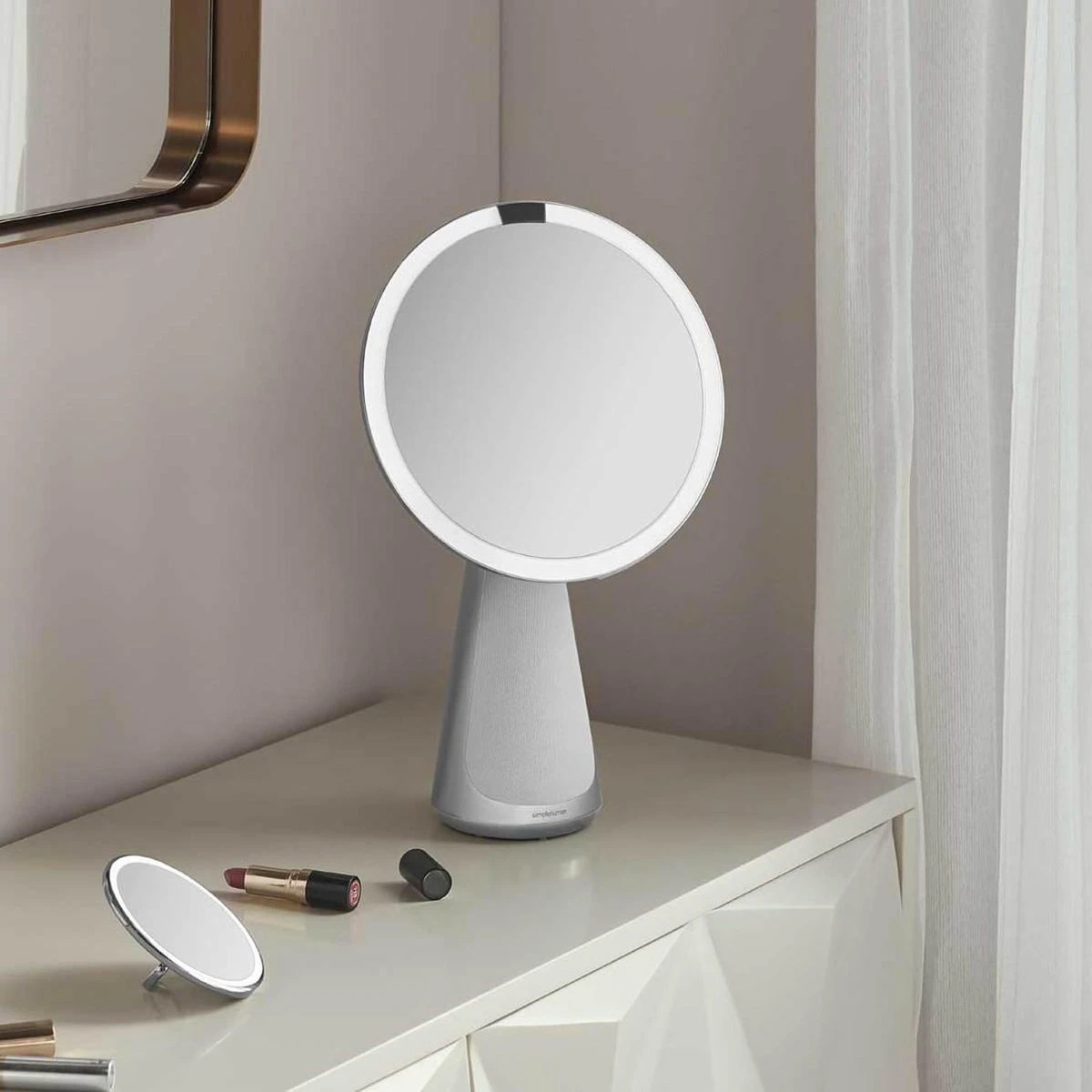 Speilet tru-lux lyssystem, som simulerer naturlig sollys, slik at du alltid vil vite når sminken din er fargekorrekt og feilfri. Bruk lysstyringslinjen til å endre lysstyrkenivået eller speile deg i et mykere lys. Last ned appen Simplehuman Mirror for å justere lydtoner, få tilgang til forhåndsinnstillinger for lys, eller slå på smarte funksjoner som nattlysmodus.