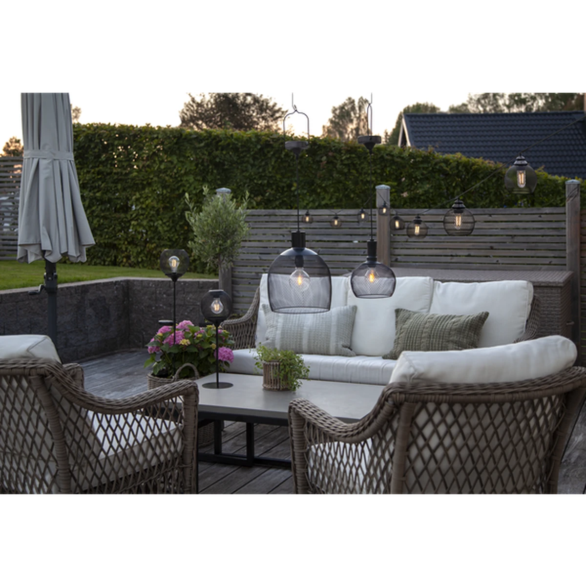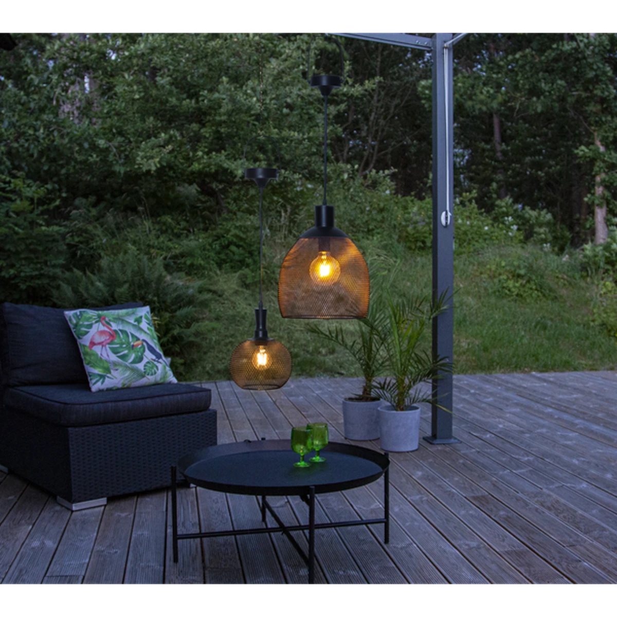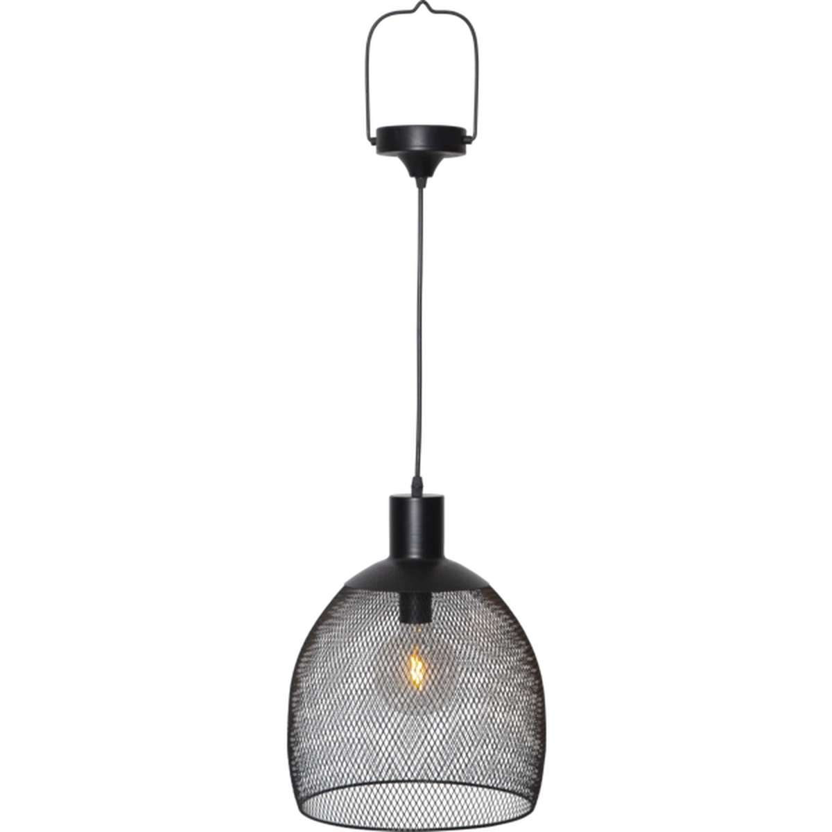 Solcelledrevet lampe i sort metall. Fin dekorasjon til å henge i en pergola, i hagen eller på balkongen. Lyser med 10 lumen etter skumring.