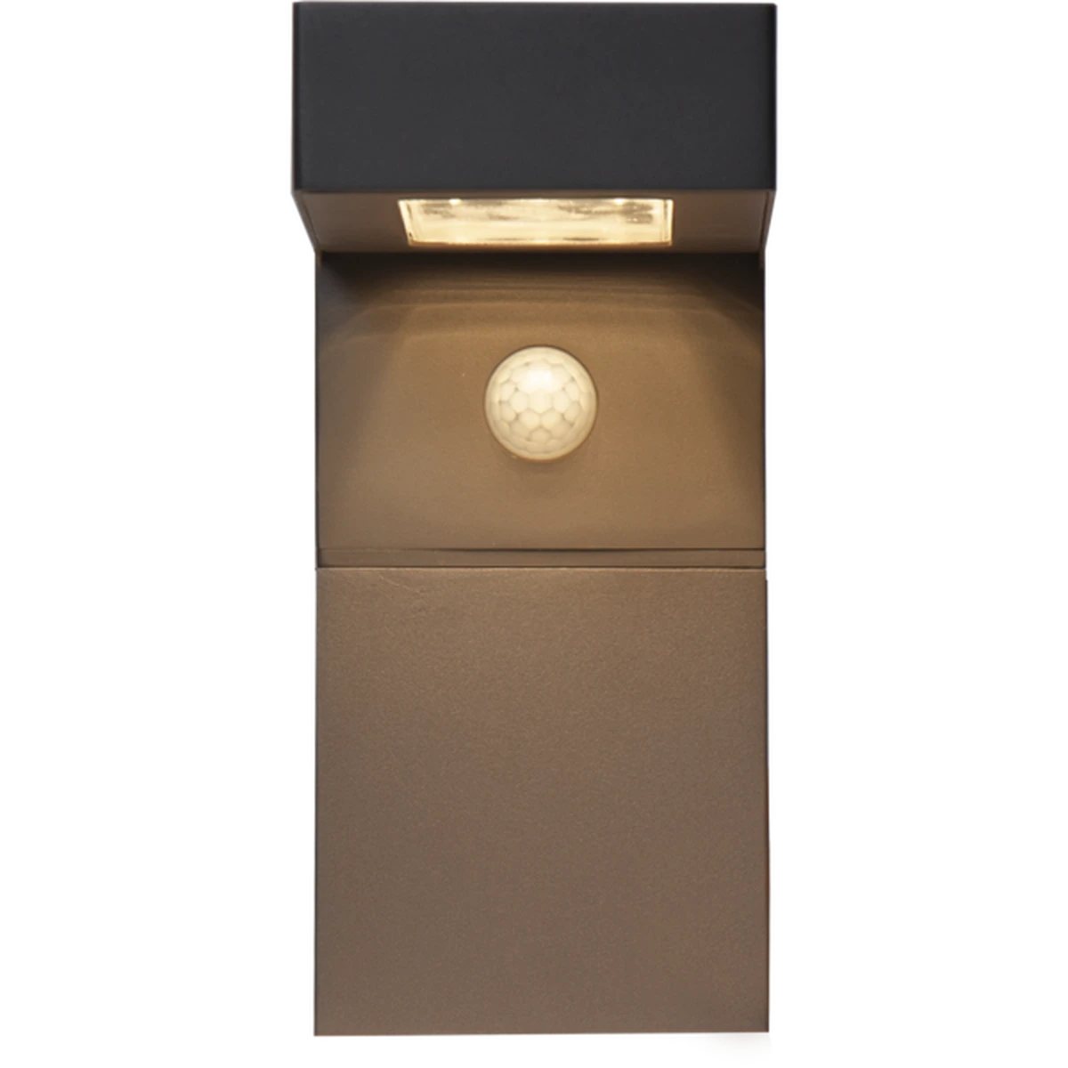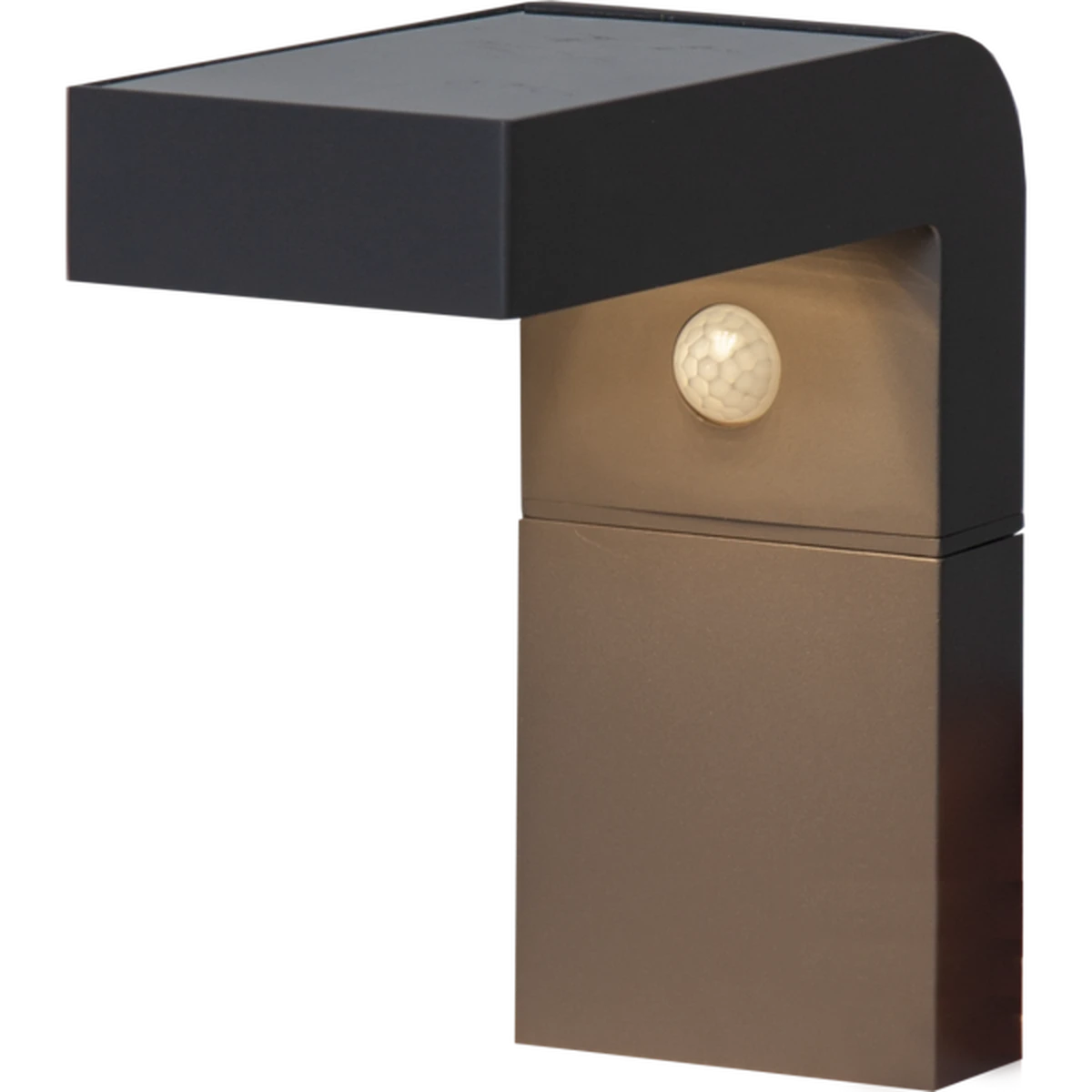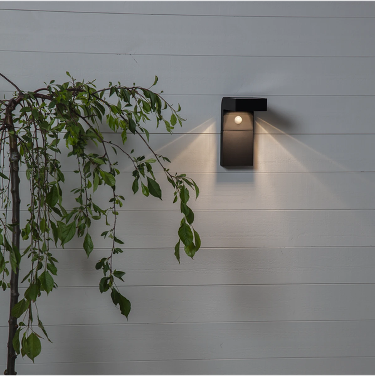 Solcelledrevet vegglampe med sensor. Lyser 300 lumen når sensoren registrerer bevegelse og etter 25 sekunder dimmes lampen ned til 30 lumen konstant lys.