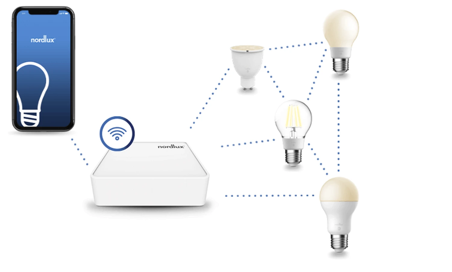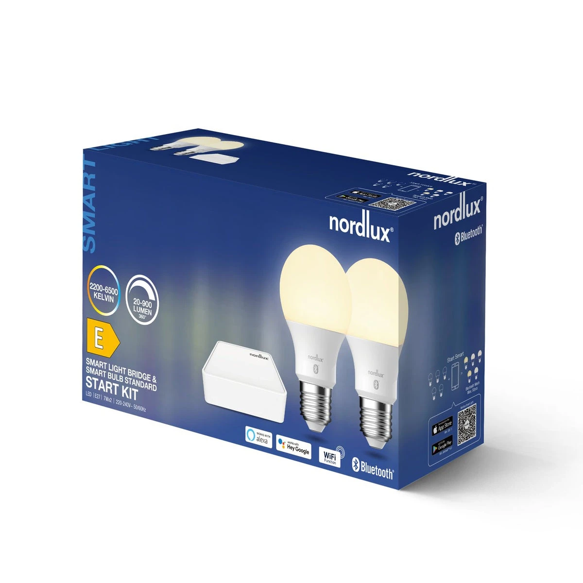 Startpakke til Nordlux smart belysning. Inkluderer 1 bridge som kobles til nettet og 2 stk lyspærer. Systemet kobles samme via mobil applikasjonen til Nordlux som lastet ned til din smart telefon.