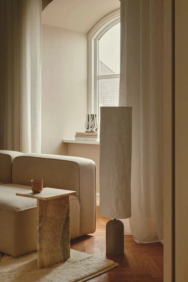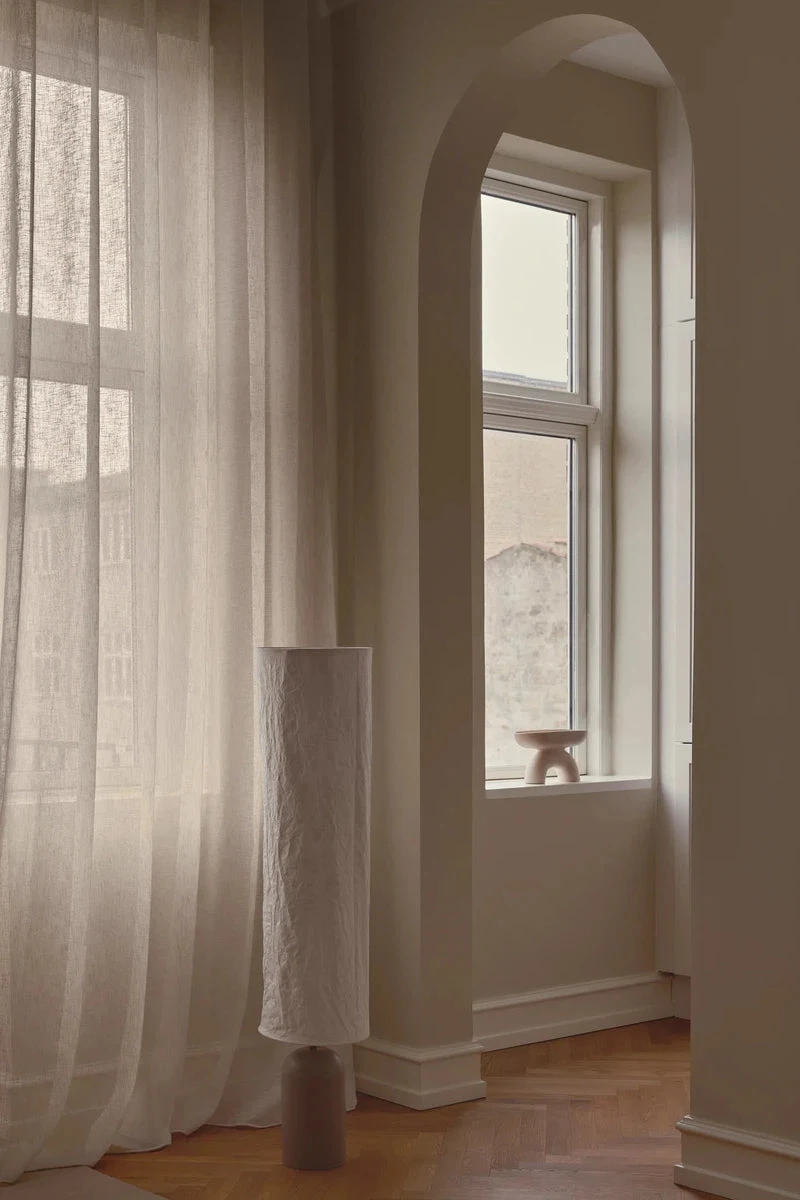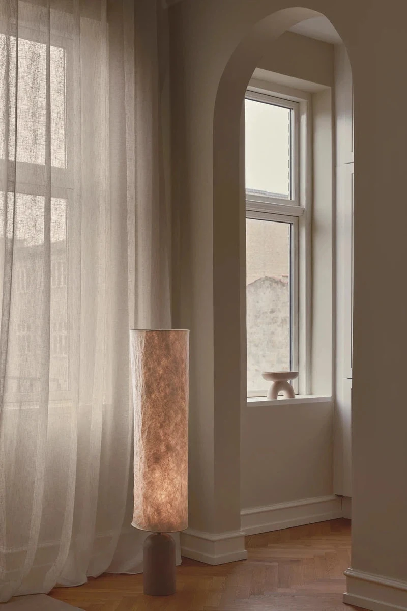 Talli er designet av danske Anker Studio og har et slankt og sylinderformet design som er både markant og lett på samme tid. Skjermen er utelukkende laget av Tyvek – et materiale kjent for holdbarhet og vakker lysspredning. Den avrundede metallfoten står i vakker kontrast til den lette skjermen.