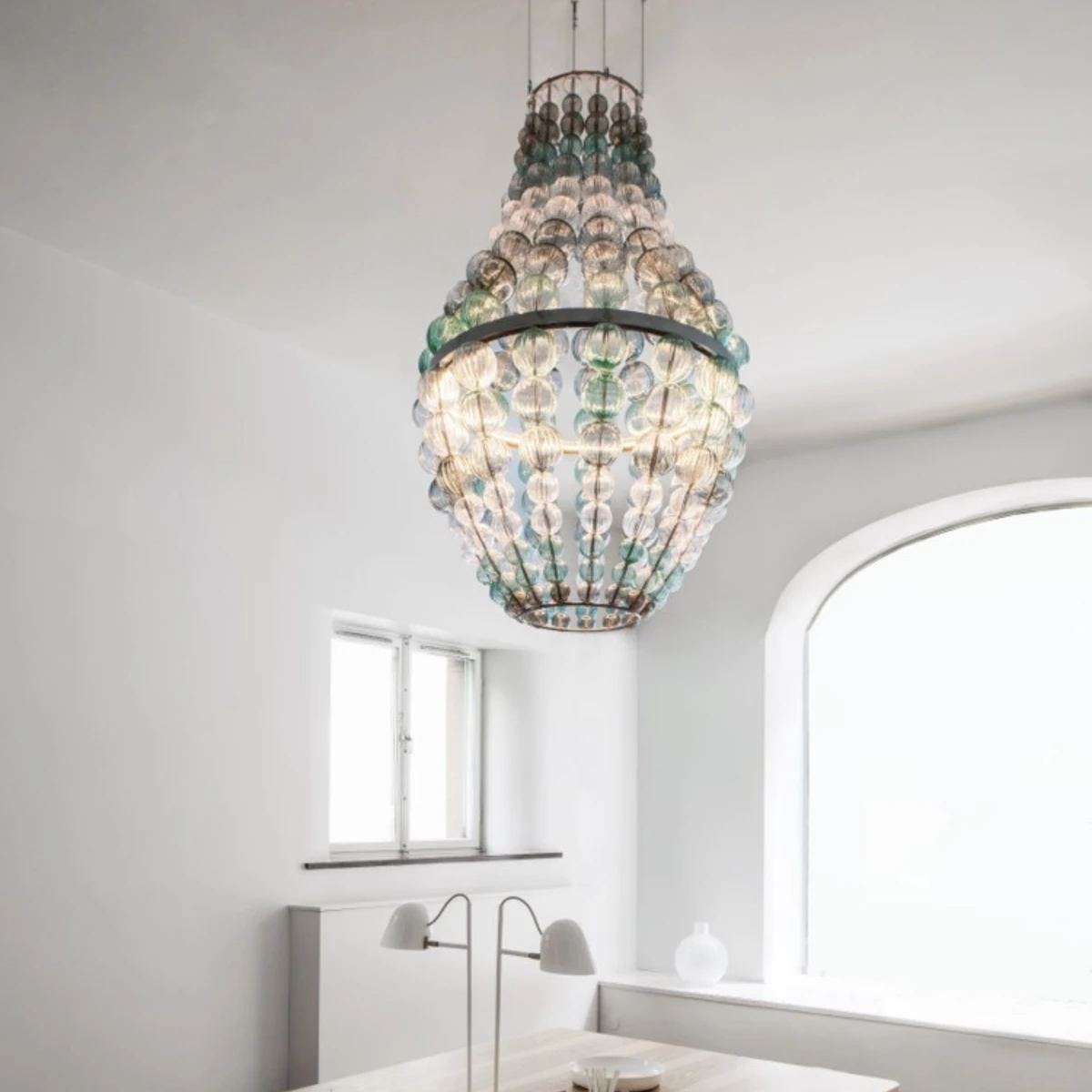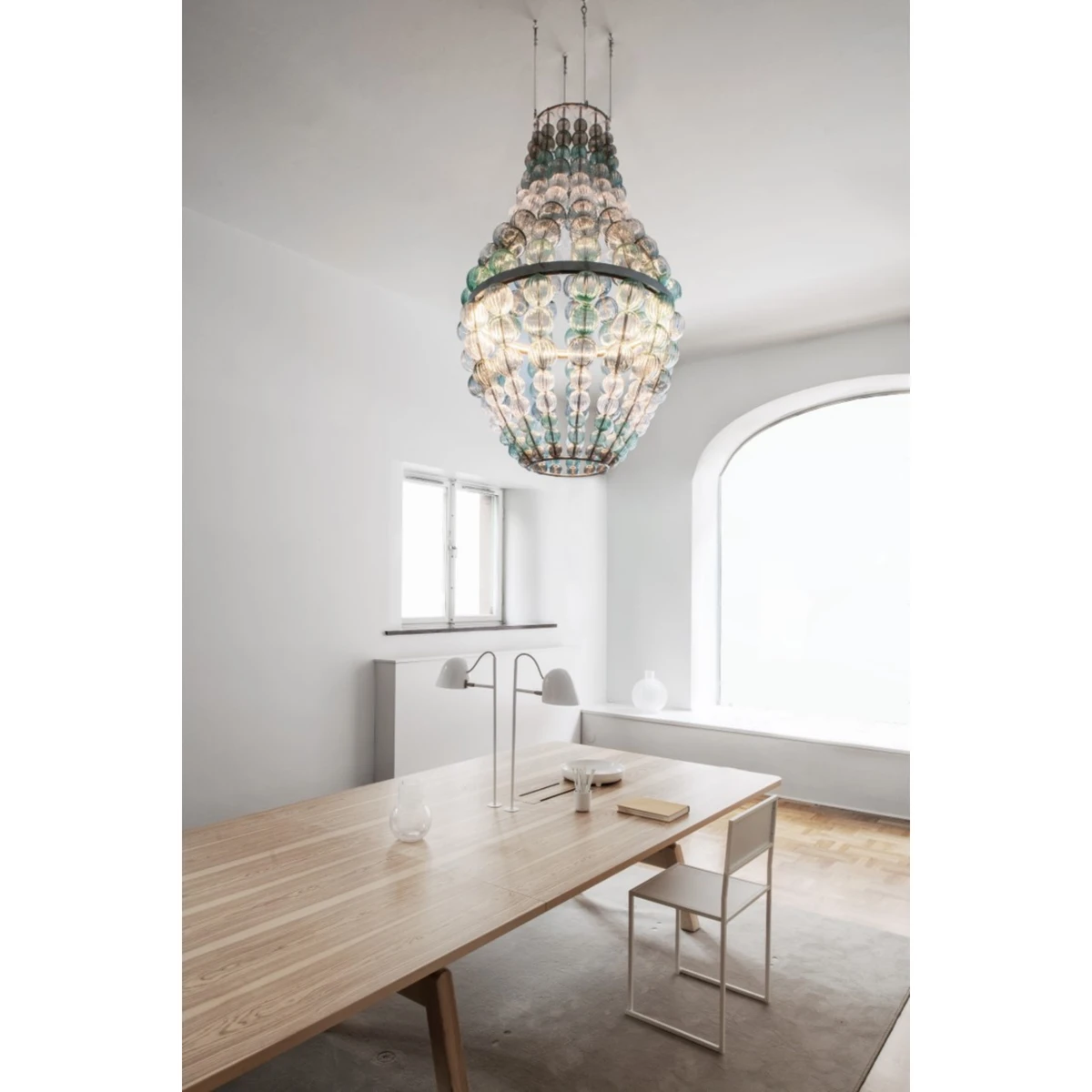 «Glass er et magisk og forførende materiale», forklarer Mena. «Å bruke glass som element sammen med jern, messing og kobber i en større armatur visker ut grensen mellom kunstobjekter og lysarmaturer.»