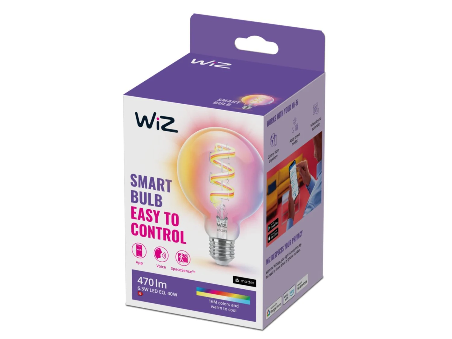 WiZ-glødepærer er laget for å bli sett – de tar seg nemlig flott ut selv når de er slått av. Men bare vent til du slår dem på! Disse runde, gjennomsiktige lyspærene som kan dimmes, fyller hvert hjørne med regnbuens farger og alle nyanser av hvitt lys fra lunt til kjølig. Få det klassiske utseendet til glødepærer samtidig som du får de energisparende fordelene med LED. Pærene kan selvsagt styres via Wi-Fi ved hjelp av WiZ-appen, WiZ-fjernkontroll eller stemmen.