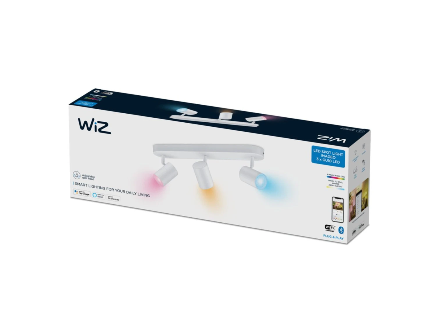 Bruk de tre justerbare spottene og det fargerike smartlyset i WiZ Imageo påbygd smartlys i hvitt for å sette preg på rommene. Du kan styre lyset gjennom Wi-Fi-nettverket i både WiZ-appen og via stemmen din.