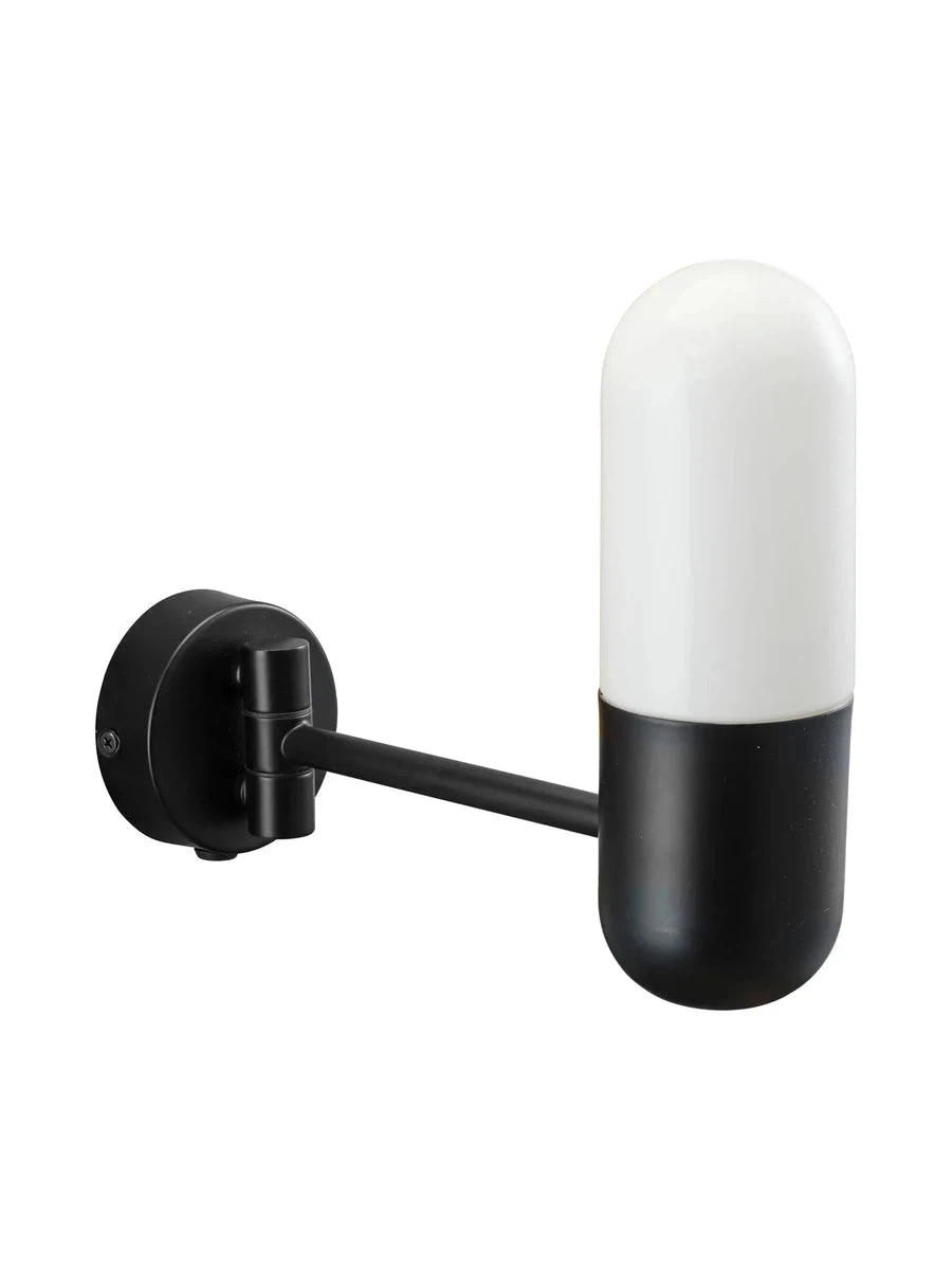 Vegglampe i minimalistisk design med opalglass og metallramme i matt sort. Vegglampens arm og lampehode kan svinges 180 grader. Lampen er beskyttet mot fukt i IP44-klassifisering og passer godt i baderomsmiljøer. Vær oppmerksom på at denne armaturen er for fast installasjon og ikke leveres med separat kontakt og tilkoblingskabel. Et kabelinnføringshull på nedre del av veggplaten letter alternativ kabelføring.